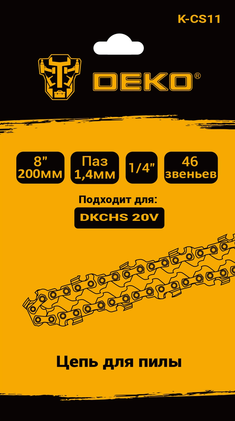 • Описание Цепь для пилы DEKO K-CS11, 8", 1/4", 1.4 мм, 46 звеньев подходит для модели DKCHS 20V. Поставляется в картонной коробке.