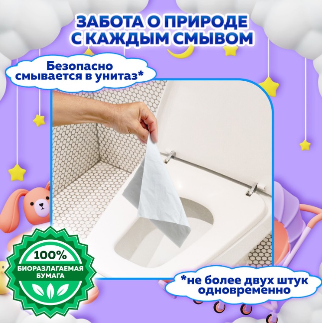 Смывается в унитаз: легко утилизируется, не засоряя канализацию (не более 2 шт. одновременно).