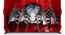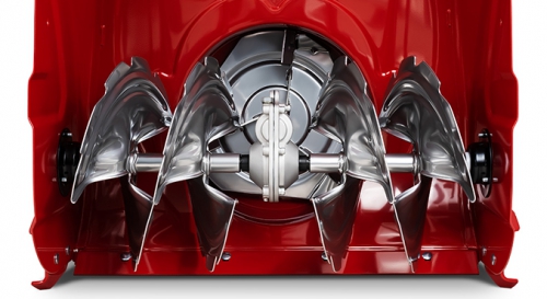 Снег попадает в корпус снегоуборщика, где измельчается шнеком с острыми выступами и подается в зону работы турбины-крыльчатки. Во втором контуре используется турбина-крыльчатка, которая вращается на повышенных оборотах и увеличивает дальность выброса снежной массы.