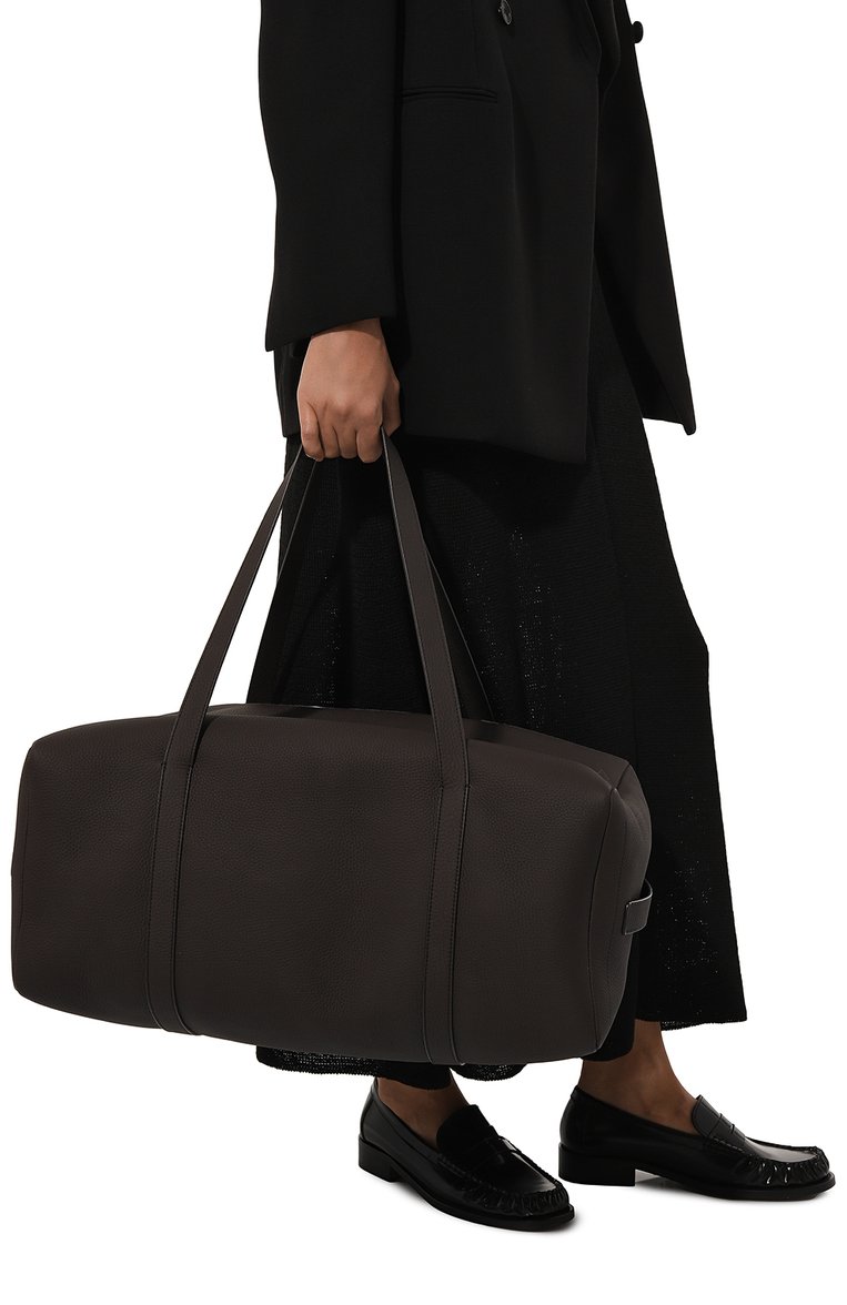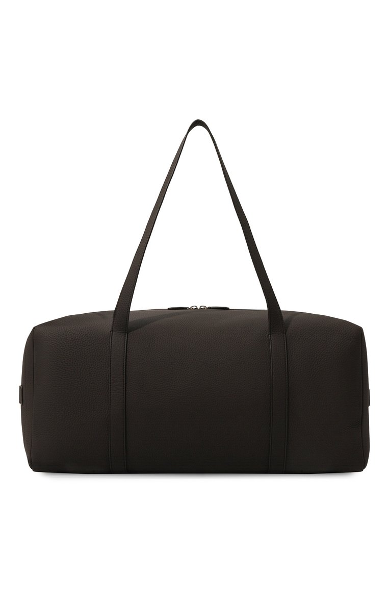 Дорожная сумка с длинными верхними и короткими боковыми ручками выполнена из зернистой матовой кожи. Лаконичный аксессуар с вместительным внутренним отделением застегивается на встречную молнию.