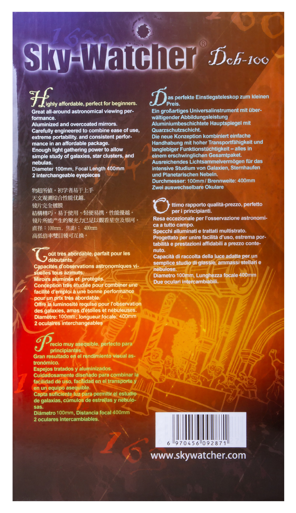 • В комплекте линза Барлоу (2х), окуляр (10 мм (40x), 25 мм (16x)), монтировка, оптический искатель (с красной точкой), инструкция, гарантийный талон