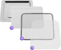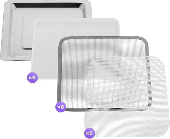 • Комплектация 6 металлических поддонов, 6 сеток для мелких продуктов и 6 силиконовых сплошных поддонов