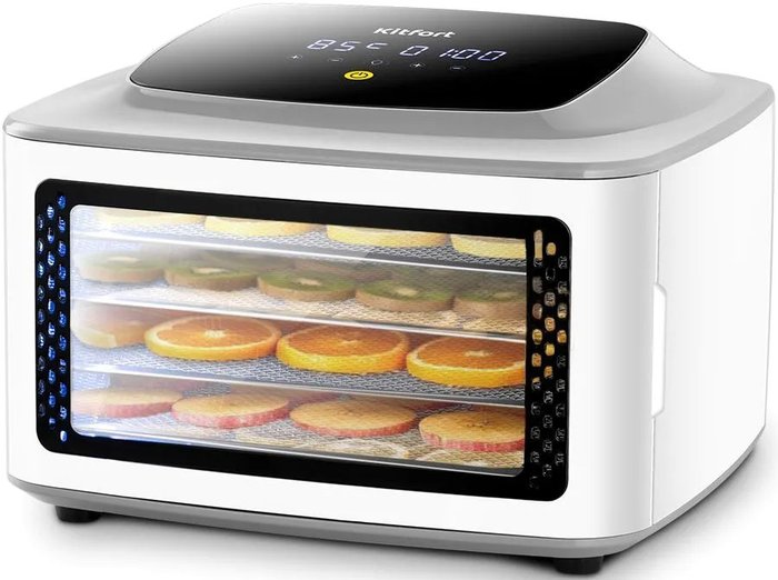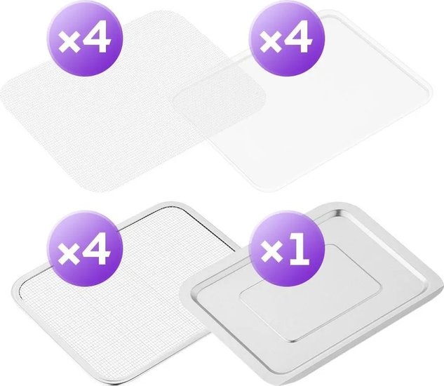 Комплектация4 металлических поддона – для большинства типов продуктов, 4 сетки – для небольших продуктов, (травы и ягоды), а также 4 силиконовых сплошных поддона – для приготовления пастилы