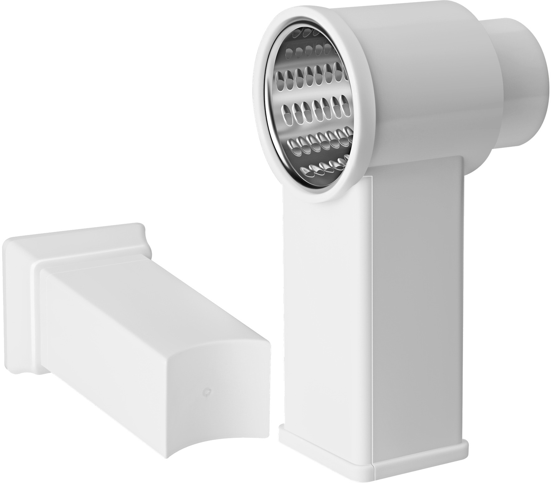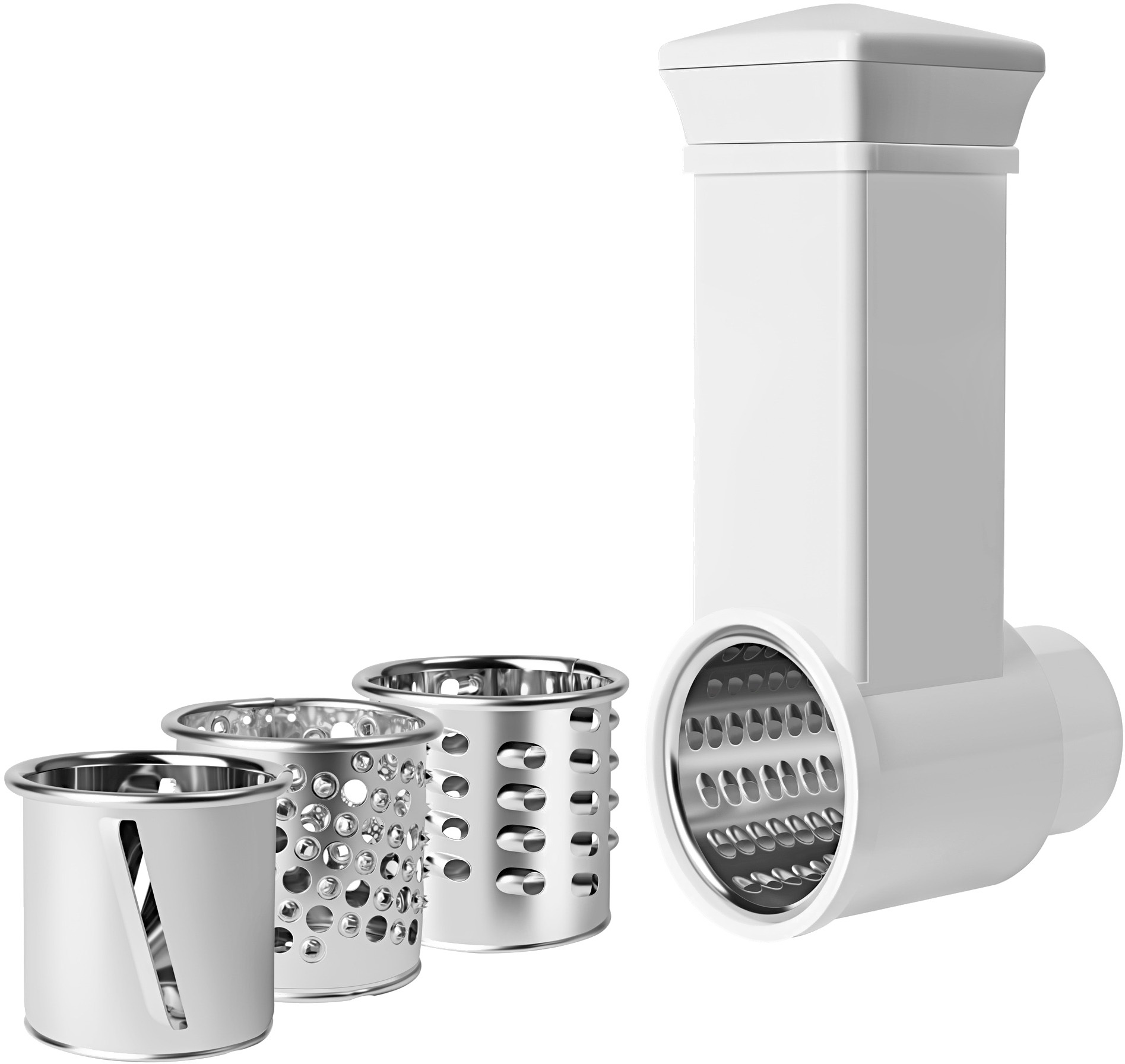 • В комплекте насадка-терка крупная, насадка-терка мелкая, насадка для драников, насадка-шинковка, толкатель
