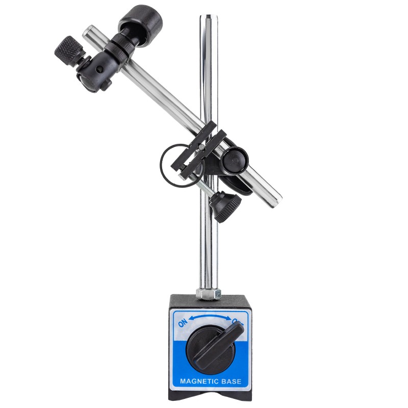 Индикатор часового типа – устройство для измерений и контроля отклонений от эталонной детали. Индикаторы без стойки не используют, так как опора придает дополнительную жесткость. Вам не надо покупать отдельно стойку, так как она идет в комплекте с индикатором. Стойку с магнитным основанием можно закреплять на горизонтальных, вертикальных или наклонных поверхностях для позиционирования измерительного устройства. Принцип действия действия часовых индикаторов основан на преобразовании линейного перемещения наконечника в соответственное перемещение стрелок циферблата. Индикатор широко применяется там, где необходим контроль горизонтальности и/или вертикальности положения плоскостей деталей, отклонения от плоскостности, параллельности, биения и т.д., служит для проверки качества в рамках стандартов и допусков на различных предприятиях – от автомобилестроения до частных мастерских.