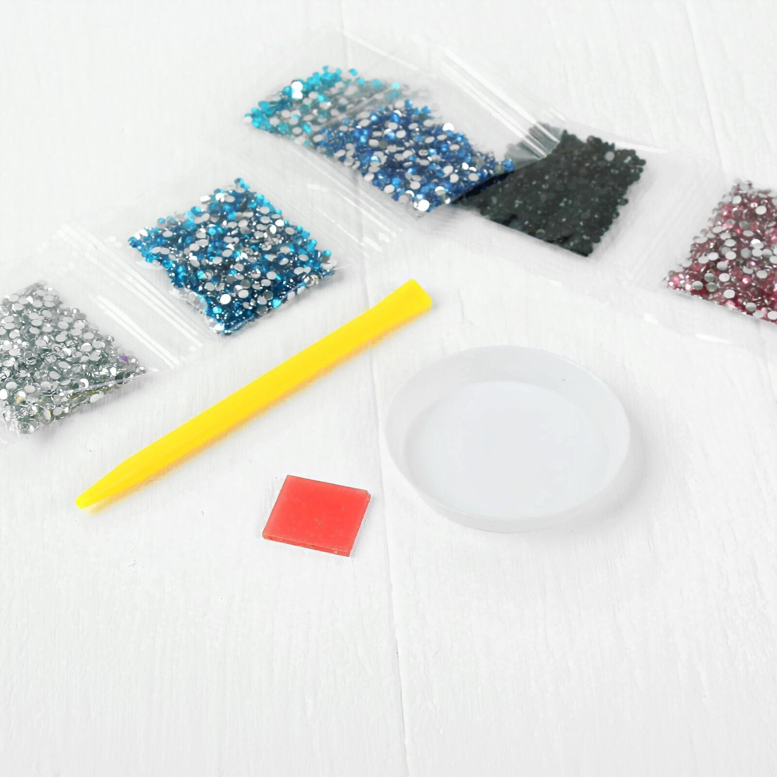 • Комплектация набора основа для картины, набор страз, клеевая подушка, лоток для страз, стилус