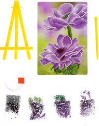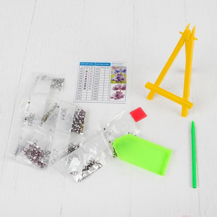 • Комплектация набора полотно-схема с клеевой основой, набор страз, лоток для страз, стилус (карандаш), мольберт, клеевая подушка