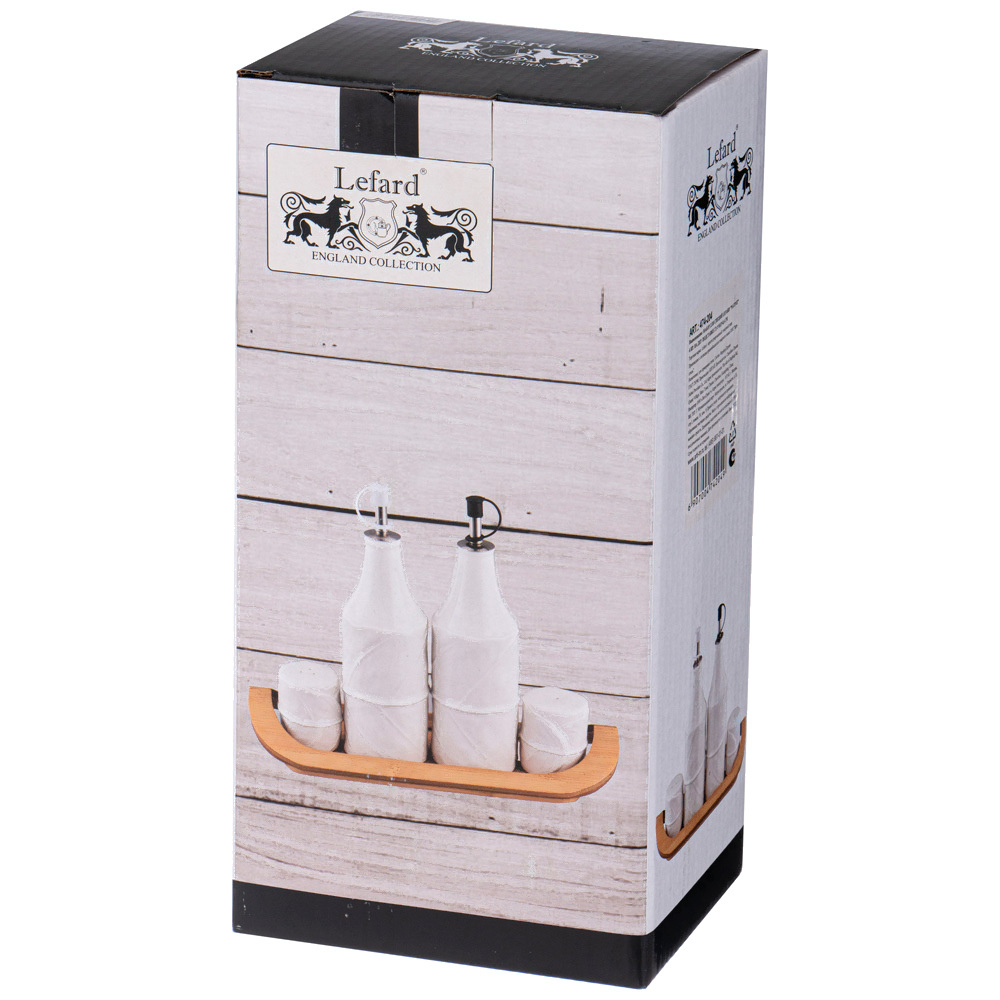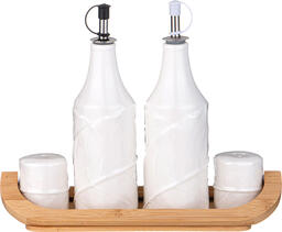 - В наборе емкость для масла/уксуса (2 шт.), солонка, подставка, перечница