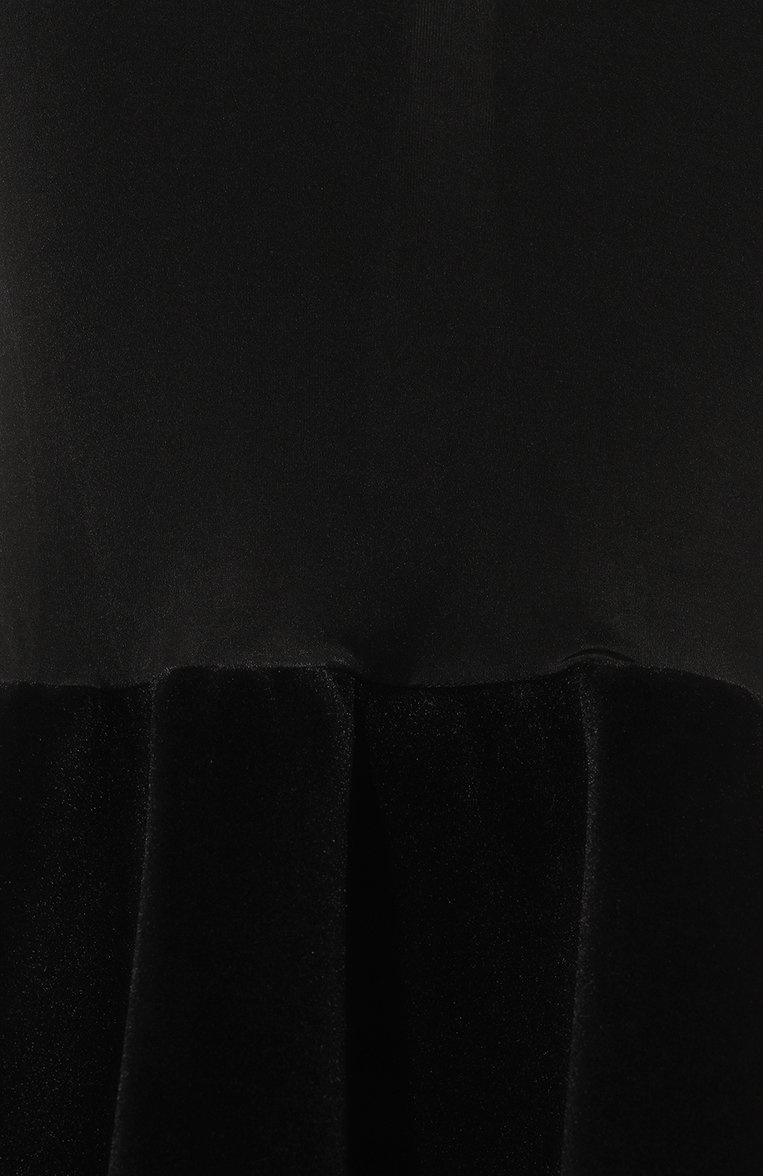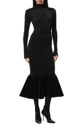 Облегающее миди-платье с высоким воротом, как у водолазки, – идеальная основа вечернего образа total black, останется только дополнить его туфлями и аксессуарами. Модель из гладкого вискозного джерси украсили на подоле широким бархатным воланом, создав контраст фактур.