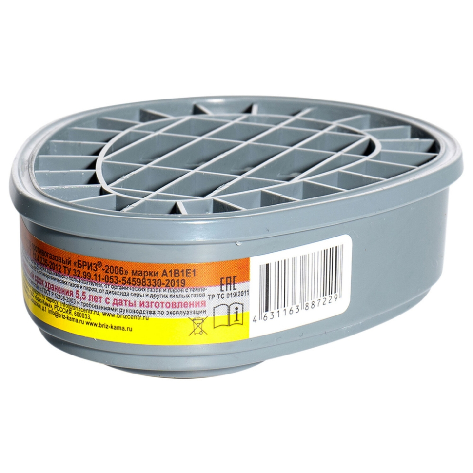 Фильтры противогазовые БРИЗ®-2006 марки ABE1 имеют универсальное байонетное соединение и предназначены для применения в составе различных фильтрующих СИЗОД производства ООО "Бриз-Кама". Предназначены для очистки вдыхаемого человеком воздуха от химически опасных и вредных токсичных веществ в том числе аварийно-химически опасных веществ ингаляционного действия (АХОВИД).Совместимы с полумаской БРИЗ®-4206 (НОТ), маской БРИЗ®-4306 (ЭВР), маской БРИЗ®-6300.Фильтры БРИЗ®-2006 ABE1 защищают от паров органических веществ с температурой кипения свыше 65 °С, неорганических газов и паров (кроме оксида углерода), кислых газов и паров.Рабочий интервал температур: от -50 °С до +50 °С. Запрещается применение противогазовых фильтров БРИЗ®-2006 ABE1 при неизвестном составе загрязняющих воздушную среду веществ в зоне применения фильтров и при концентрации кислорода ниже 17% в воздушной среде зоны применения фильтров.Фильтры соответствуют требованиям ГОСТ 12.4.235-2012 (ГОСТ 12.4.235-2019), ТР ТС 019/2011, ТУ 32.99.11-053-54598330-2019.Фильтры имеют заключение Министерства промышленности и торговли Российской Федерации о подтверждении производства средств индивидуальной защиты на территории РФ.Комплектация:1) комплект фильтров БРИЗ®-2006 ABE1,2) руководство по эксплуатации,3) полиэтиленовый пакет или пленка БОПП.Характеристики:1) начальное сопротивление воздушному потоку при расходе воздуха 30 дм3/мин – не более 100 Па,2) масса комплекта БРИЗ®-2006 – не более 300 г.Время защитного действия:1) циклогексан при концентрации 3,5 мг/дм3 – 70 минут,2) хлор при концентрации 3,0 мг/дм3 – 20 минут,3) сероводород при концентрации 1,4 мг/дм3 – 40 минут,4) циановодород при концентрации 1,1 мг/дм3 – 25 минут,5) диоксид серы при концентрации 2,7 мг/дм3 – 20 минут.Cертификат – ТР ТС 019/2011. Тип товара: фильтр. Вид: расходные материалы. Степень защиты до: A1B1E1. Класс фильтра: 1. Соответствие стандартам: ГОСТ 12.4.235-2012 (ГОСТ 12.4.235-2019), ТР ТС 019/2011, ТУ 32.99.11-053-54598330-2019.. Количество в упаковке: 2 шт.. Способ крепления: байонет Бренд - Бриз-Кама. Производитель - Россия. . Штрихкод - 4631165605630