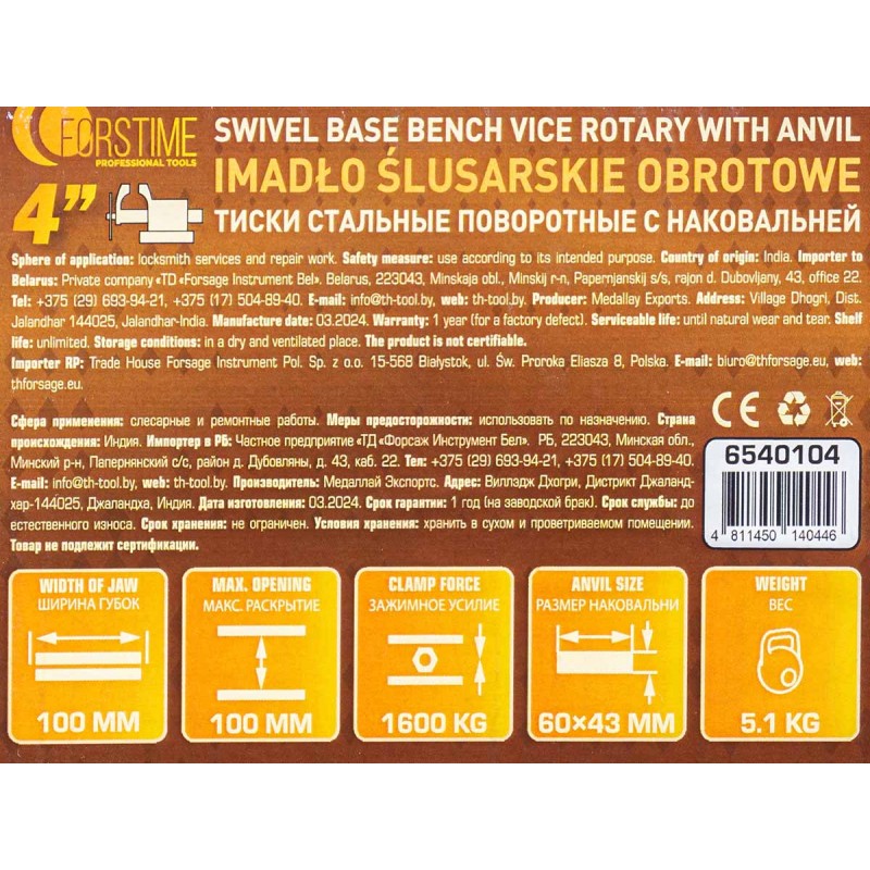 FT-6540104 Тиски стальные поворотные с наковальней 4''(100мм)