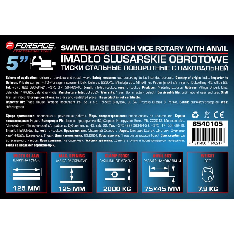 F-6540105 Тиски стальные поворотные с наковальней 5''(125мм)