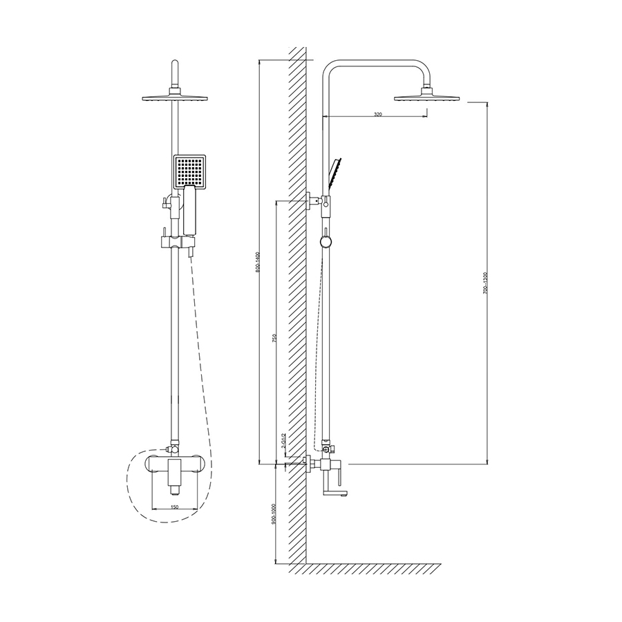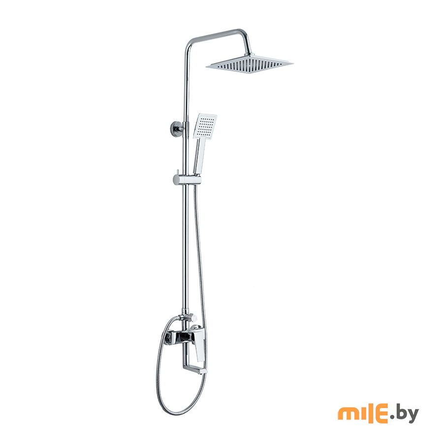 Душевая система со смесителем для ванны с изливом. Выдвижная телескопическая стойка (высота функциональная 700-1300 мм). Лейка верхнего душа (ABS-пластик): размер 220x200 мм. Ручная лейка: 1 режим, 100 мм. Смеситель латунный с поворотным изливом, переключатель отдельный трехканальный (ручной душ-верхний душ-излив). Металлический шланг 1,5 м.