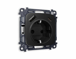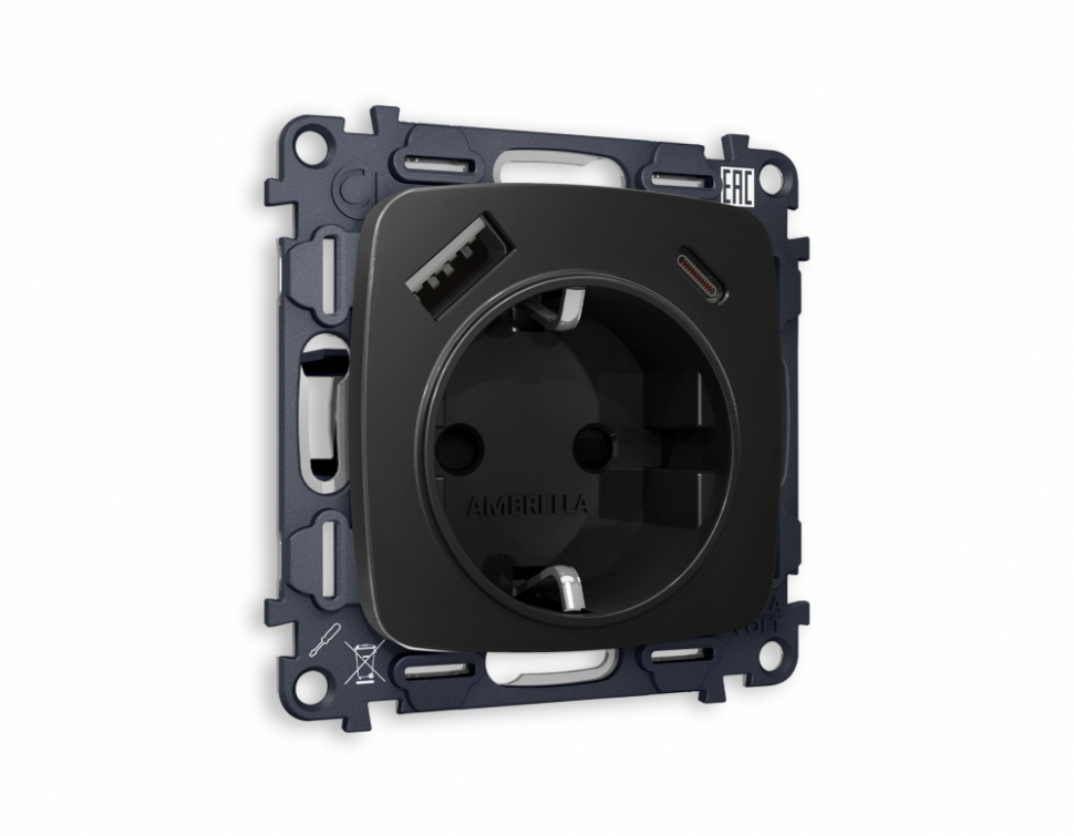 Розетка 2USB A+C 20W быстрая зарядка с заземлением и шторками 2P+E 16A-250V Ambrella Volt (Черный матовый) QUANT OMEGA 756098