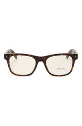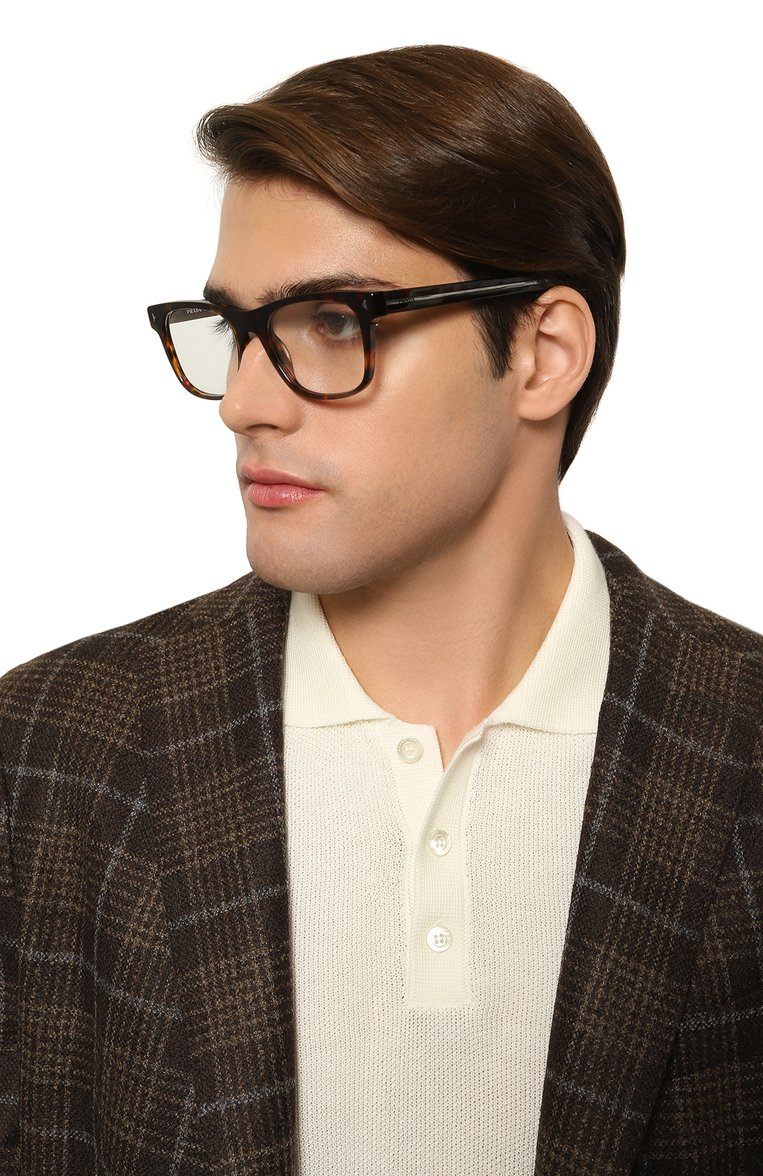 Классическую квадратную оправу черепаховой расцветки выполнили из ацетата. Аксессуар с миниатюрными треугольниками в углах ободов украсили узкой брендированной полосой на дужках.