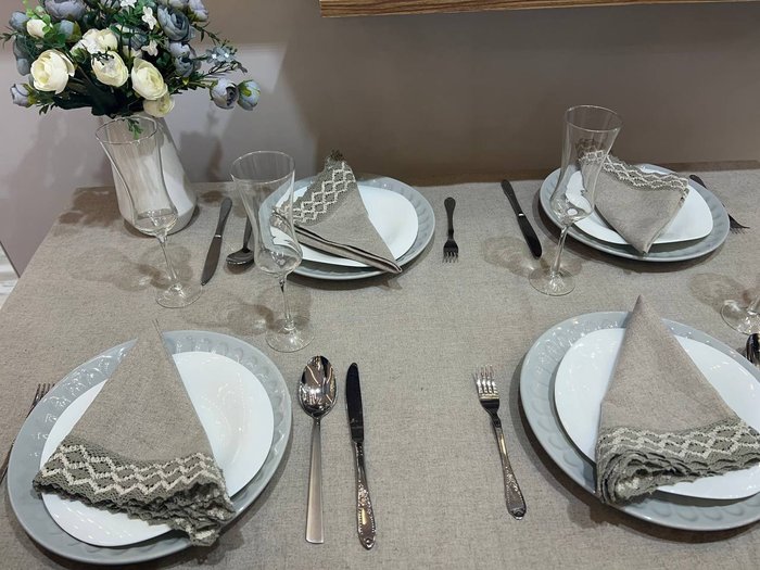 - Размеры длина 250 см (скатерть, 43 см салфетка), ширина 145 см (скатерть, 43 см салфетка)