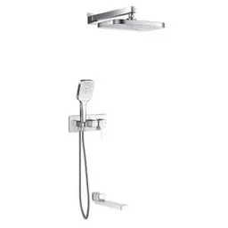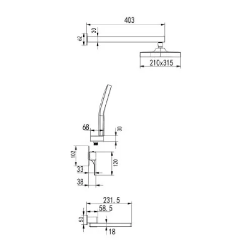 - Состав комплекта с душевой лейкой, с шлангом для душа, с кронштейном, верхний душ, внутренняя часть смесителя, с настенным держателем, смеситель, шланговое подключение