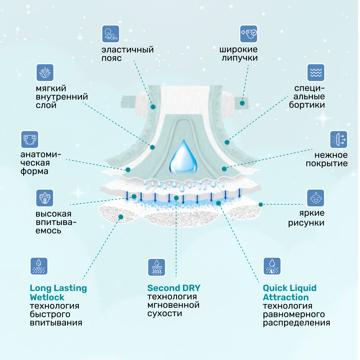 • Особенности дышащий материал, защита от протекания, эластичные элементы, многоразовые липучки