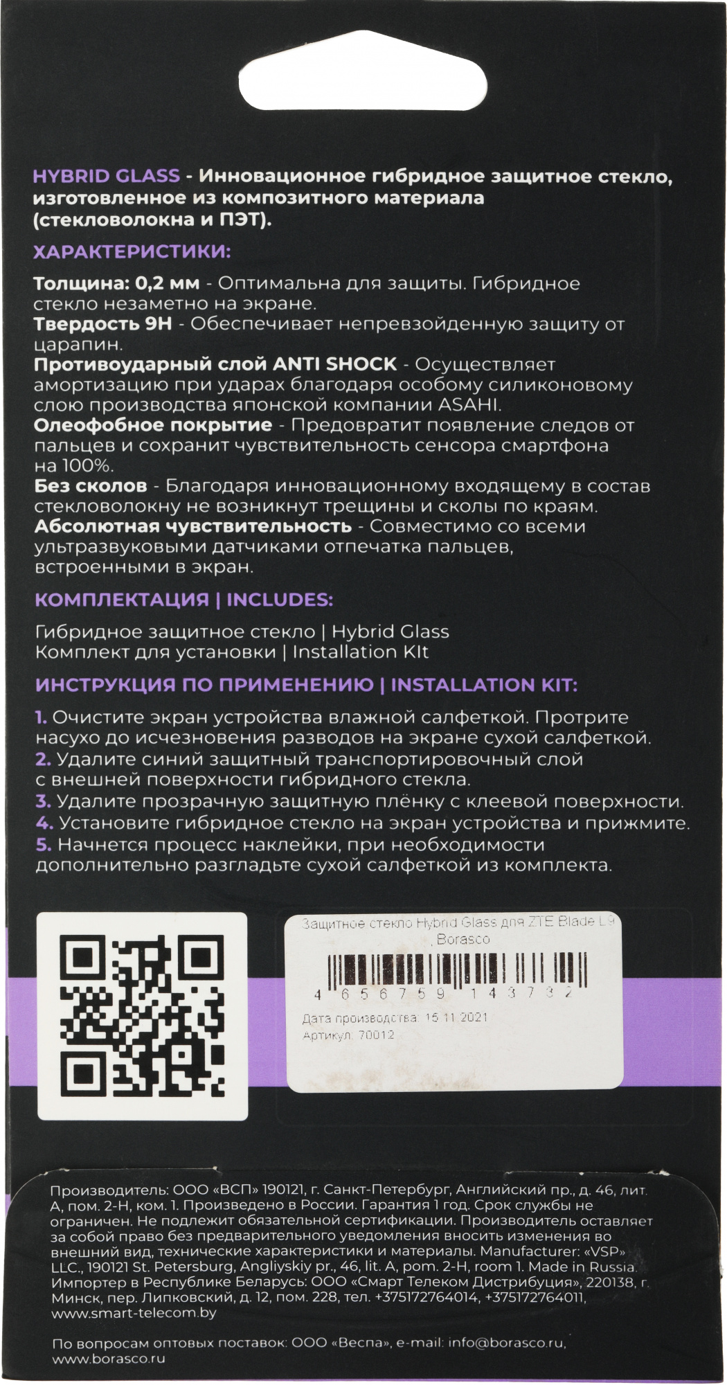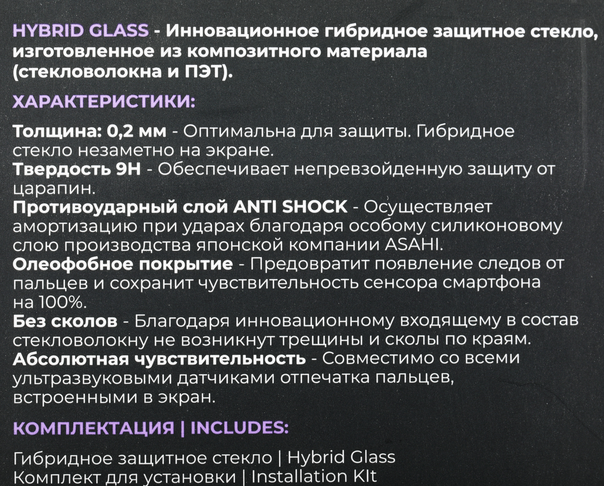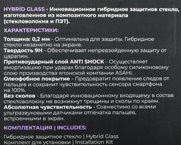 ОсобенностиТолщина 0,2 мм, твёрдость 9H, противоударный слой, олеофобное покрытие, не скалывается по краям.