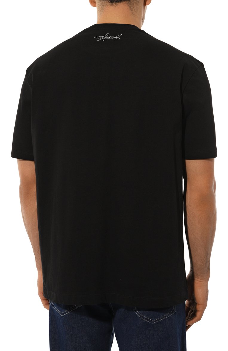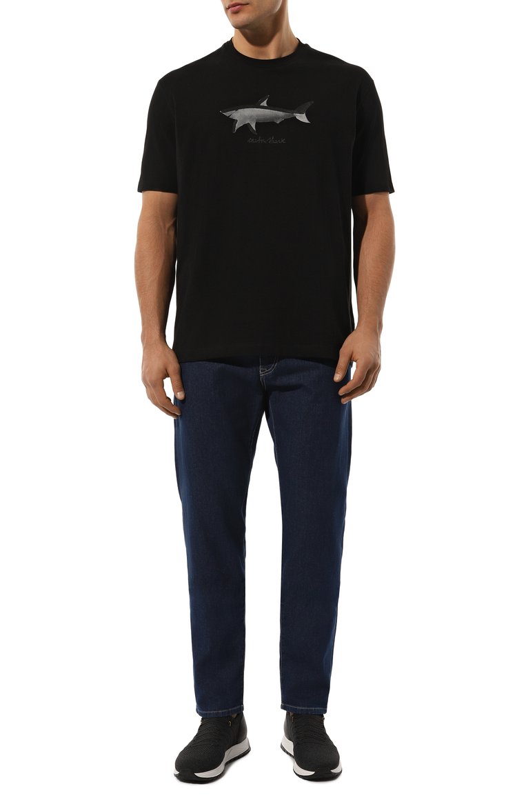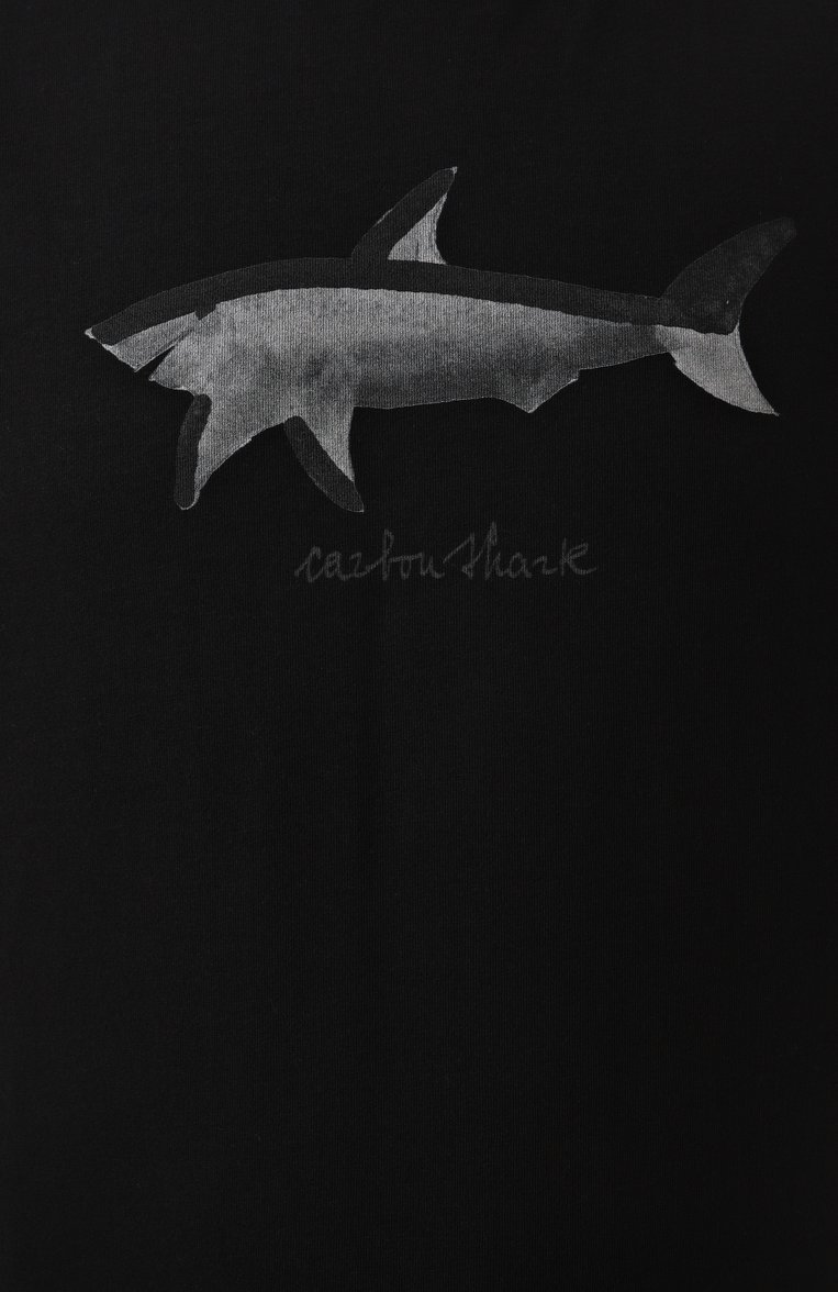 Футболку украсили спереди небольшой надписью и изображением акулы, которому вторит контрастная эмблема сзади. Для изготовления модели использовали хлопковое джерси.