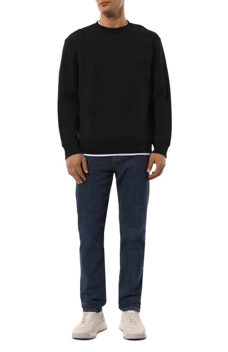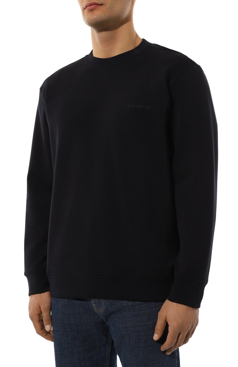 Свитшот выполнили из хлопка с добавлением нейлона и спандекса. На груди вышили логотип марки в тон, а спинку украсили градиентным принтом в виде трех фирменных акул.
