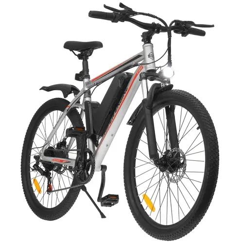 Электровелосипед HIPER Engine MTB A2 – мощное и надежное средство передвижения для езды по бездорожью. Он обладает прочной алюминиевой рамой и выдерживает нагрузку до 130 кг. Мотор мощностью 350 Вт позволяет велосипеду развивать скорость в пределах 25 км/ч. Для выбора скорости предусмотрены 7 положений. nКолеса диаметром 26 дюймов гарантируют комфортную езду по разным покрытиям. Для безопасности передвижения в HIPER Engine MTB A2 есть дисковые передние и задние тормоза, а также LED-фонарь. Одного заряда аккумулятора емкостью 10000 мА*ч достаточно для 40 км езды.