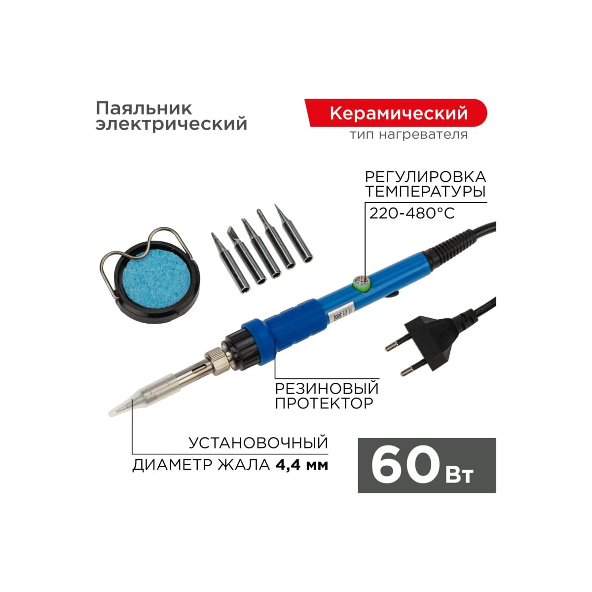 Паяльник Rexant 12-0614 подставка, набор из 5 жал, керамический нагреватель, 220-480 C, 220В/60Вт