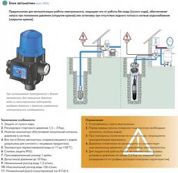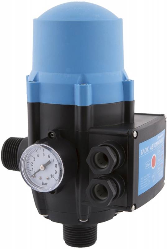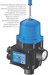 Описание1. Защита от сухого хода; 2. Регулировка стартового давления 1,5 – 3,5 бар; 3. Наличие манометра для визуального контроля давления; 4. Допустимое давление до 10 бар; 5. Минимальный проток воды 1,3 л/мин; 6. Максимальный проток воды 166 л/мин; 7. Максимальный коммутируемый ток 5 А.
