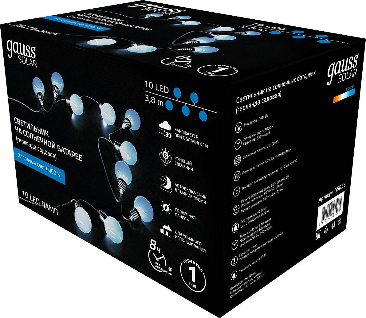 Гирлянда Gauss Solar GS033 нить шарики 10лам. дл.3.8м