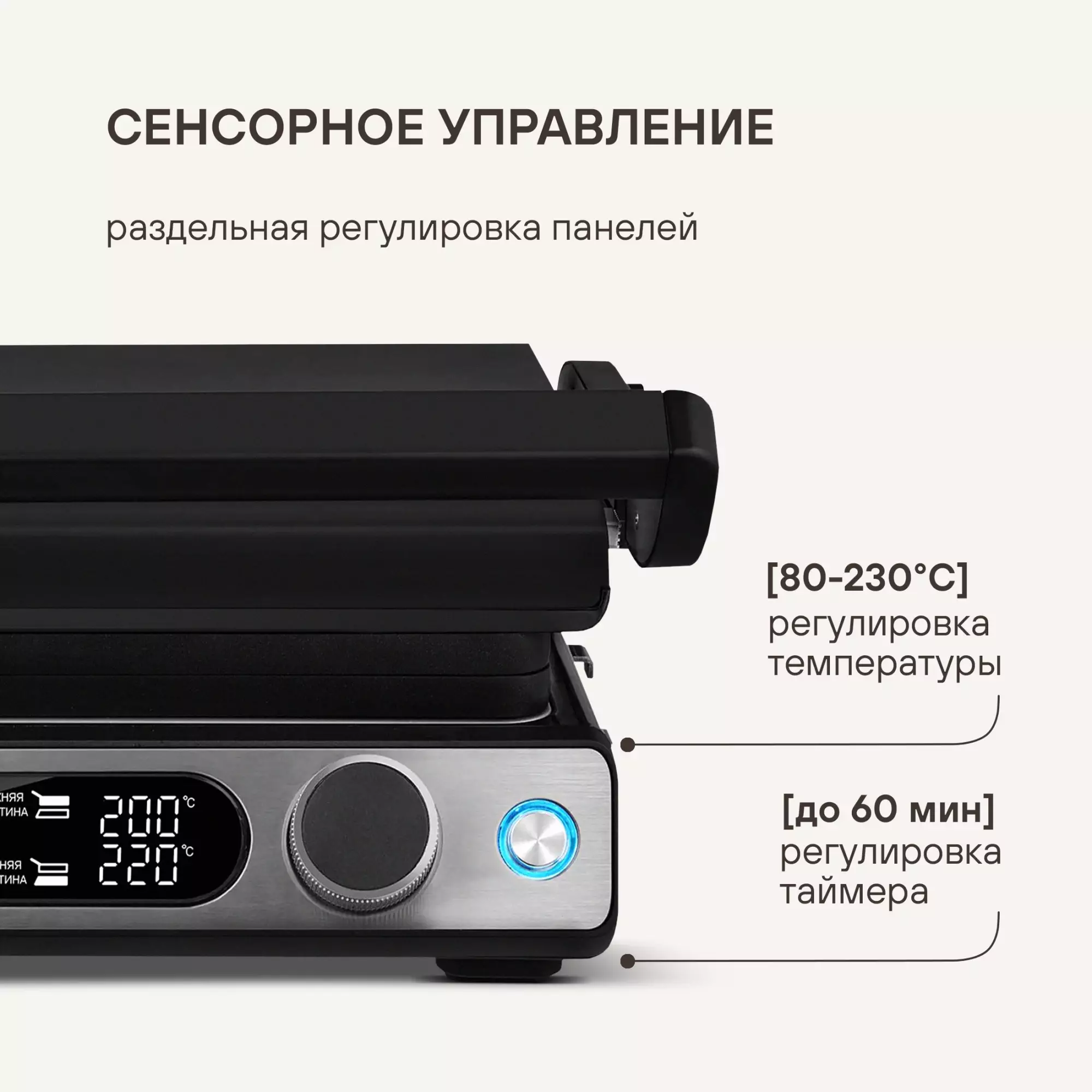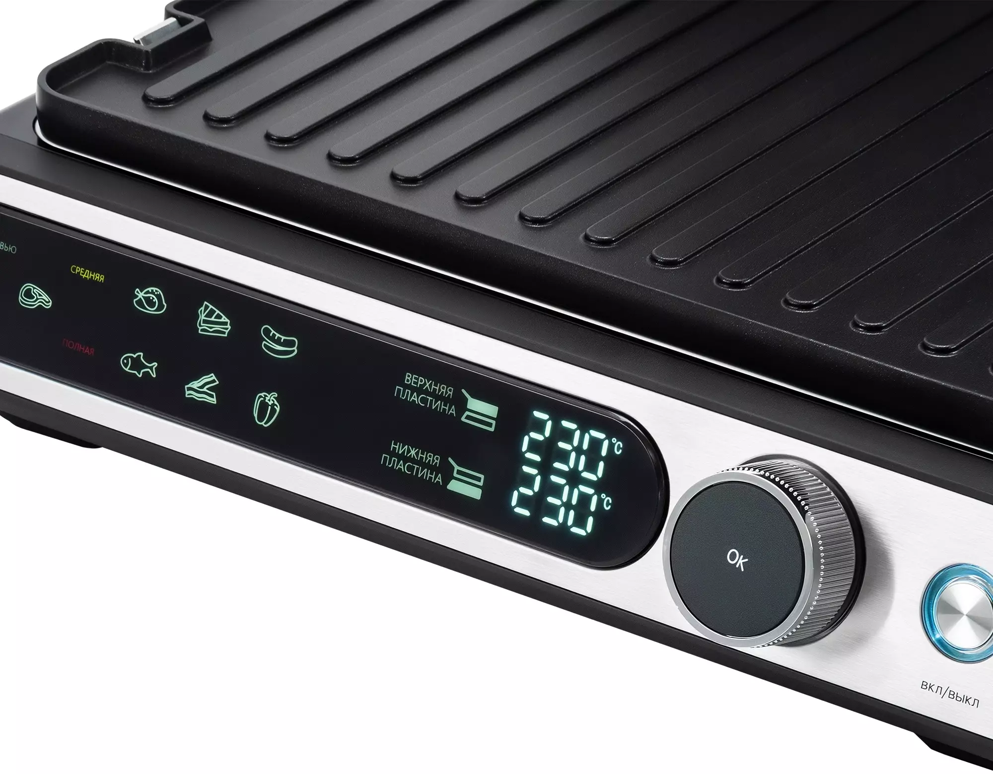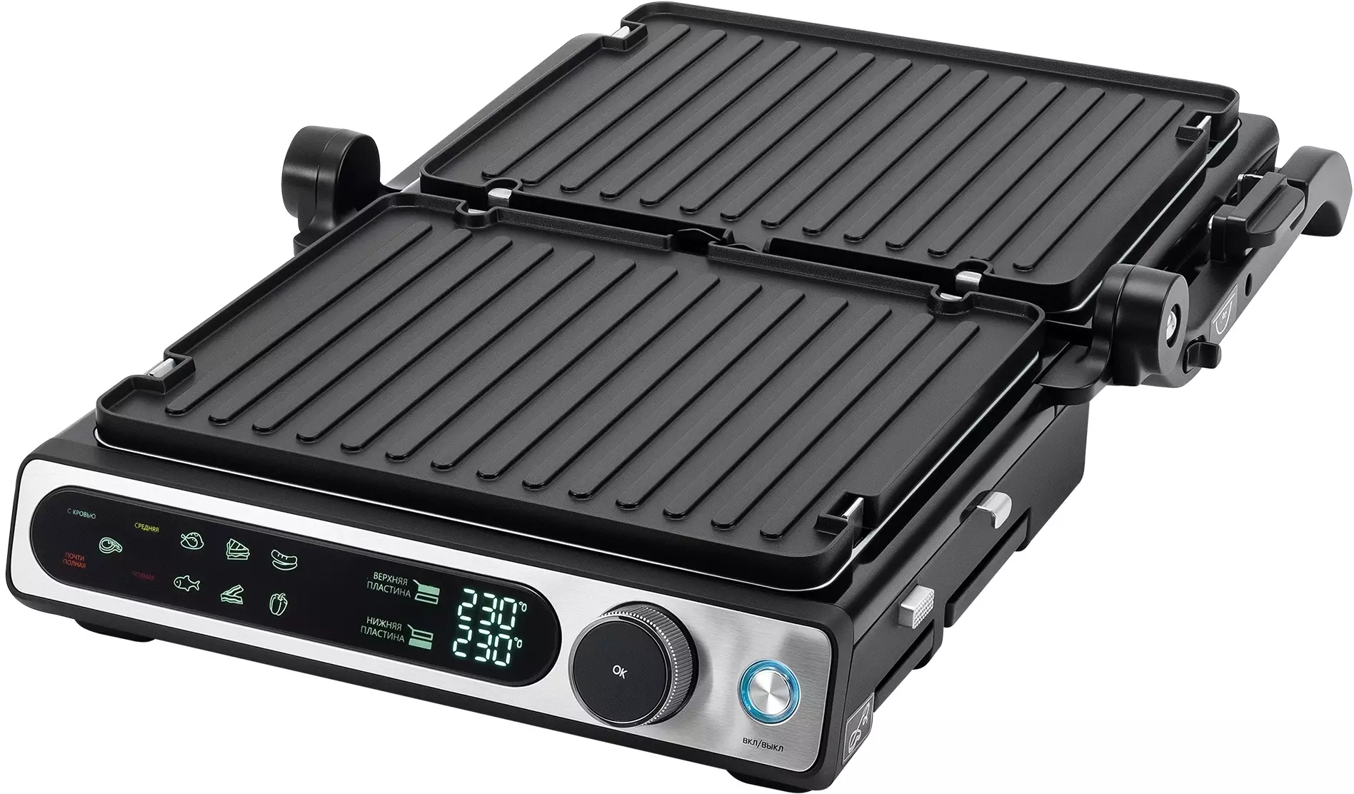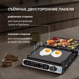 ОсобенностиИнтуитивное и понятное сенсорное управление всеми установками и программами. 6 автоматических программ для приготовления, а так же ручной режим, для оптимальных настроек для каждого типа продуктов, открытие на 180° для работы в режиме барбекю.