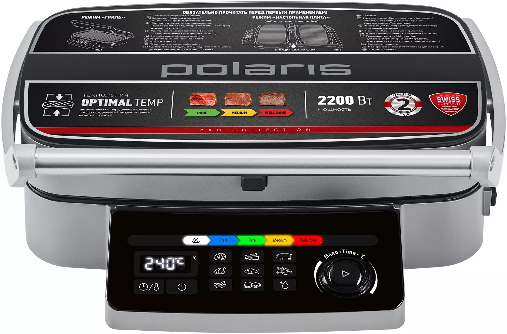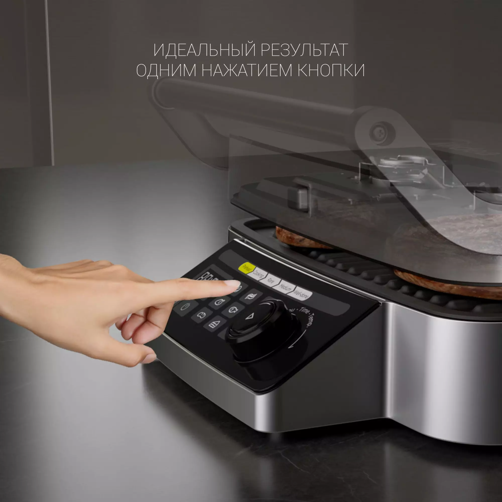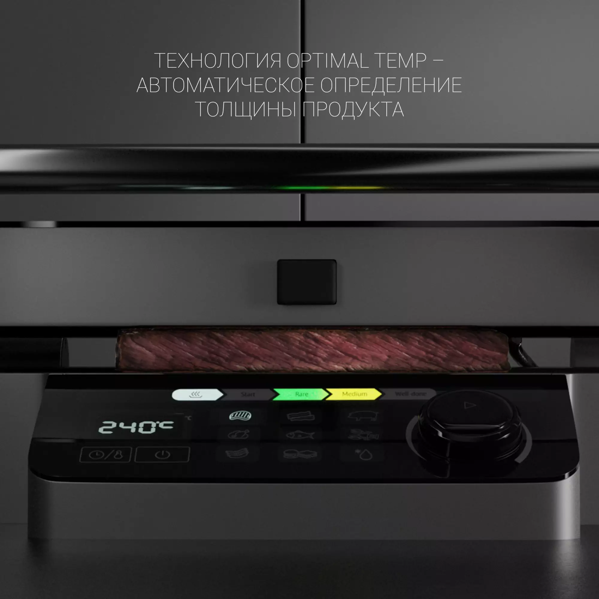 ОписаниеТехнология Optimal Temp - автоматическое определение толщины продукта, идеальный результат одним нажатием кнопки. 9 автоматических программ. 3 степени прожарки: RARE, MEDIUM, WELL DONE.