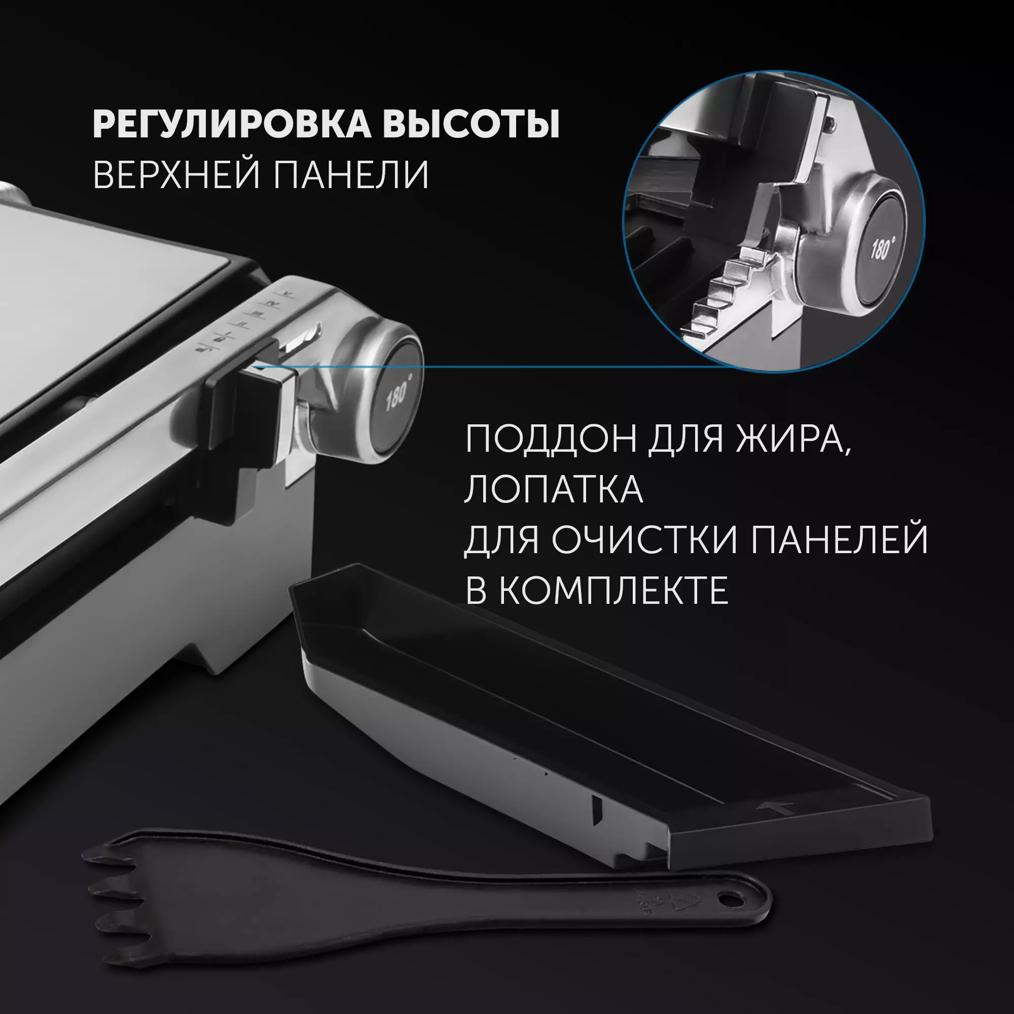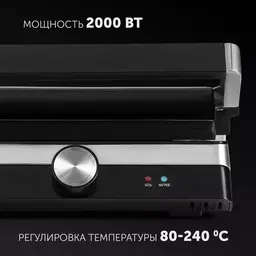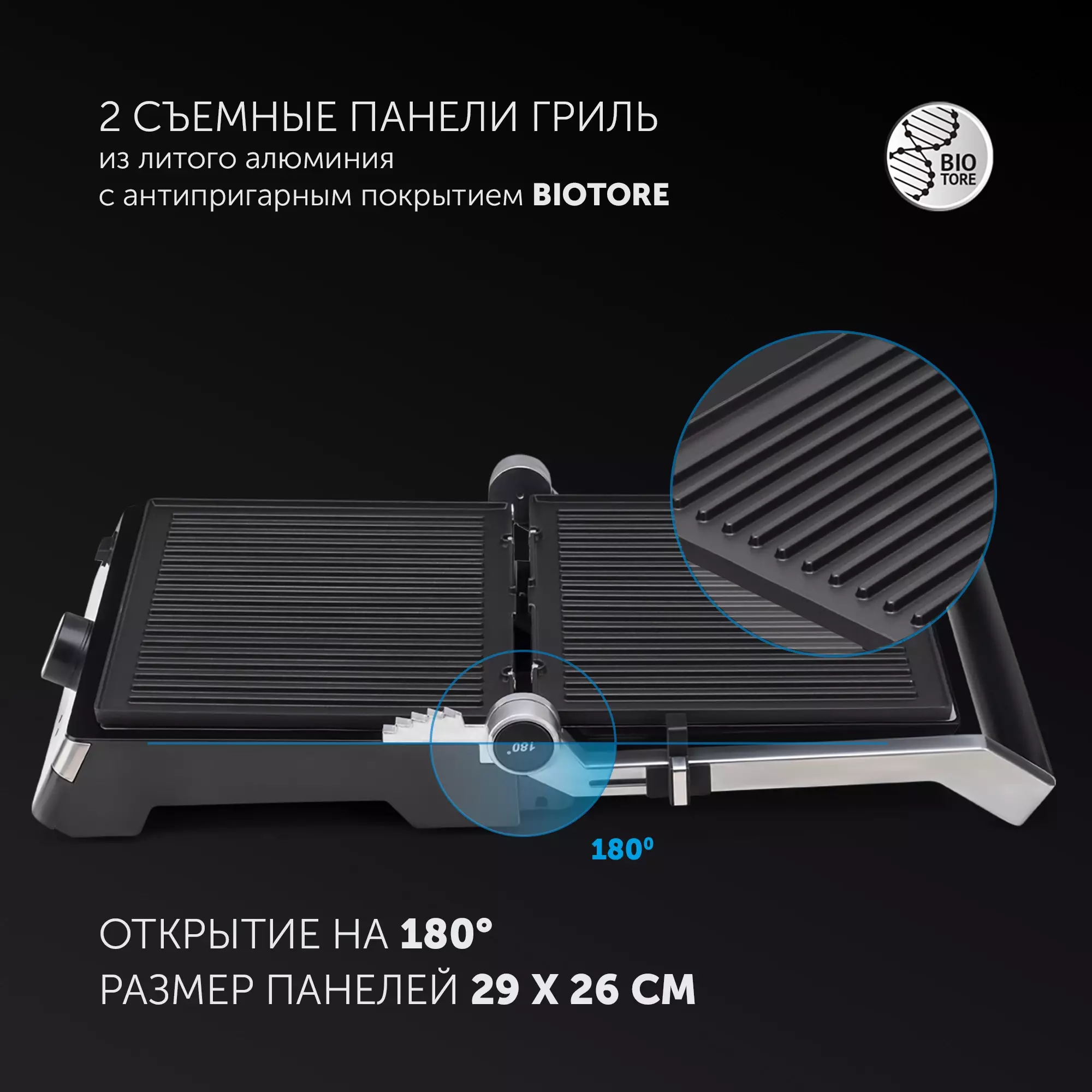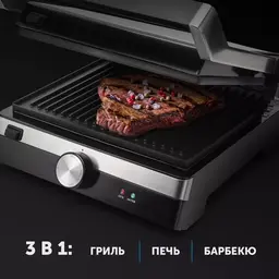 Описание3 в 1: Гриль, Печь, Барбекю. 2 съемные панели с антипригарным покрытием BIOTORE. Плавная регулировка температуры. Возможность использования в открытом положении. Рабочие поверхности раскрываются на 180". Рифленые панели способствуют равномерной прожарке.