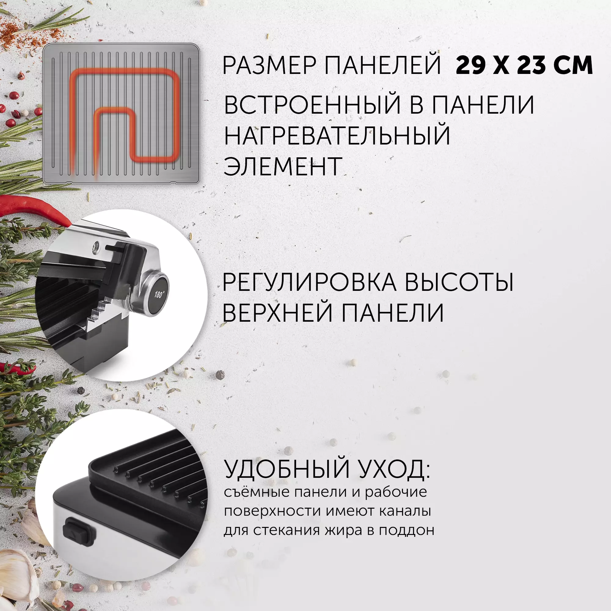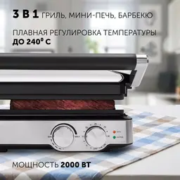 • Описание 3 в 1: Гриль, Мини-печь, Барбекю. Плавная регулировка температуры - до 240? С. Таймер на 30 минут.