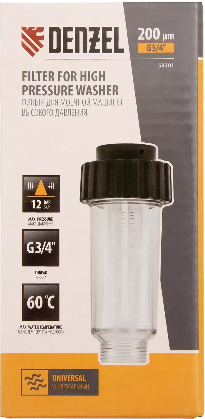 ОписаниеУниверсальный фильтр высокого давления Denzel арт. 58301 используется для очистки воды в моечных машинах и защиты от засорения. Он устанавливается на патрубок мойки с соединением G3/4" на модели марки Denzel.
