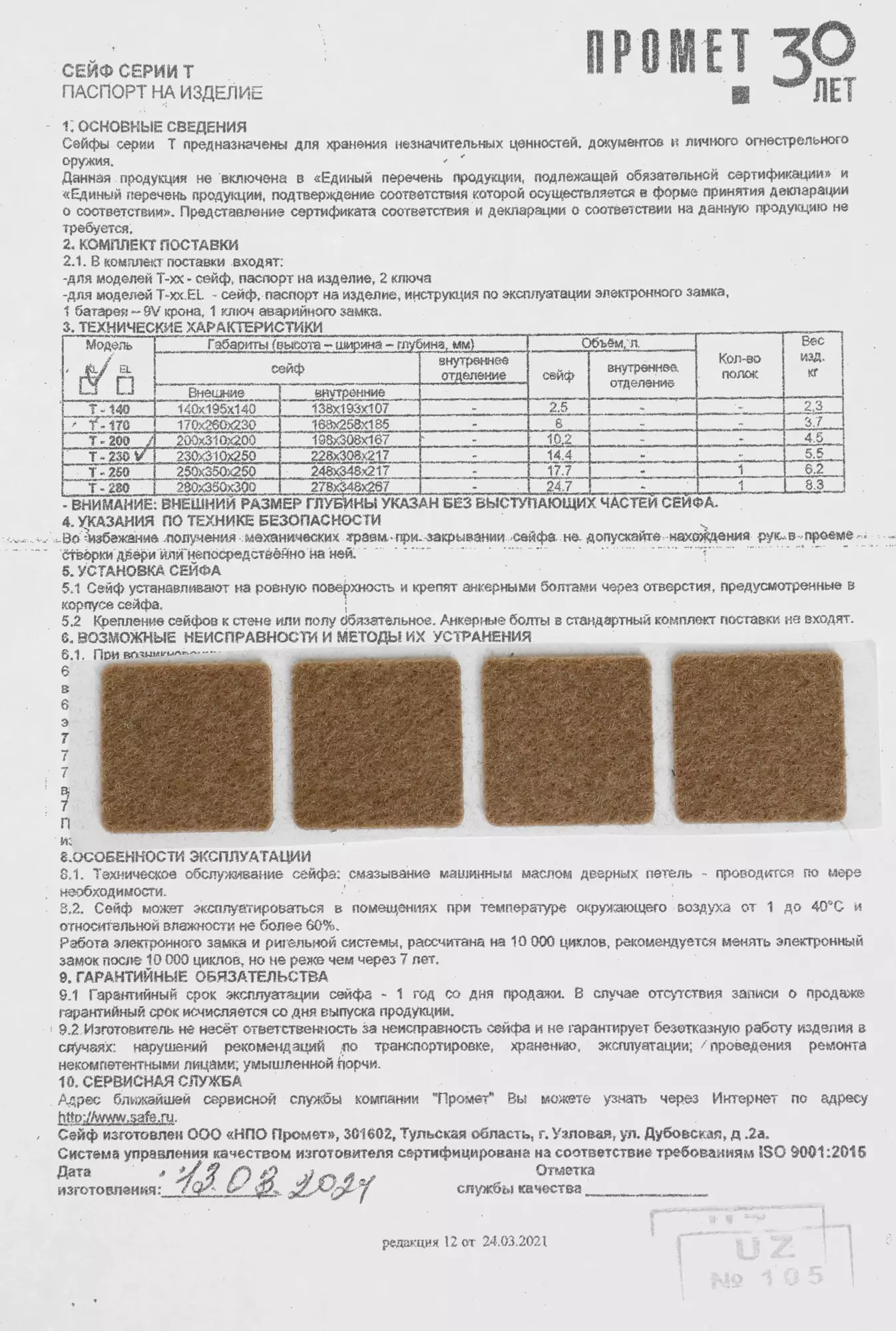 • Особенности Предназначен для хранения незначительных ценностей, документов и личного огнестрельного оружия.