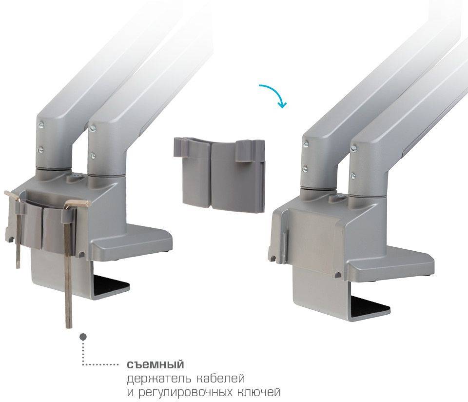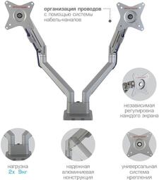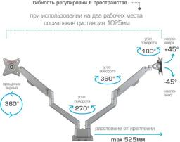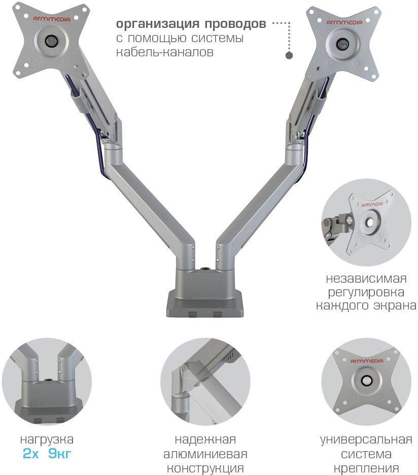 ОсобенностиНезависимая регулировка каждого экрана - мониторы можно поворачивать вокруг своей оси на 360°, наклонять вверх и вниз, придвигать или удалять, Встроенная газовая пружина обеспечивает движение экрана вверх и вниз, фиксацию в любом промежуточном положении