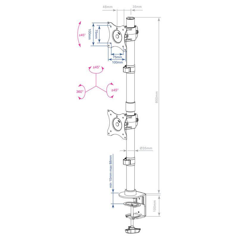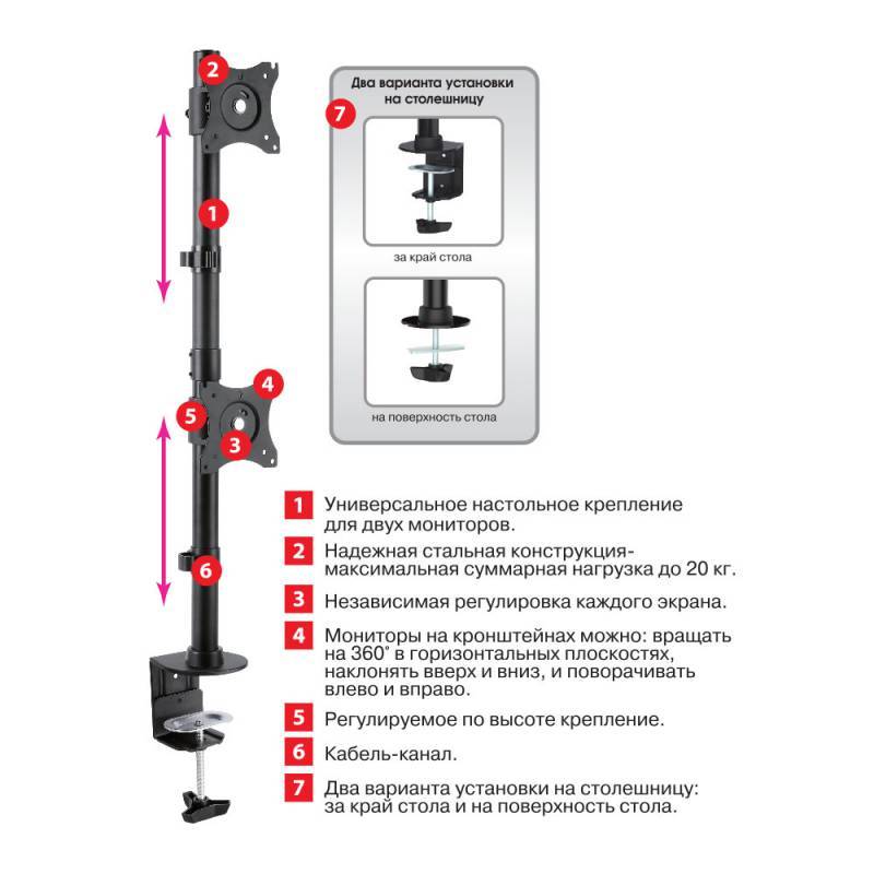ОписаниеМониторы на кронштейне можно: вращать на 360° в горизонтальной плоскости, наклонять вверх и вниз, и поворачивать влево и вправо. Кабель-канал. Два варианта установки на столешницу: за край стола и на поверхность стола.