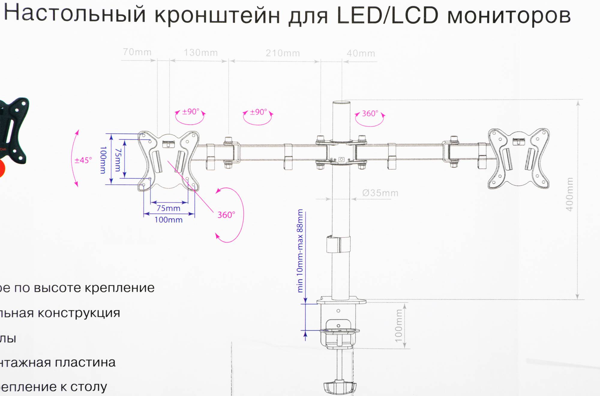 ОсобенностиМаксимальная нагрузка: 2x8 кг. Регулируемое по высоте крепление. Мощная стальная конструкция. Съемная монтажная пластина. Надёжное крепление к столу