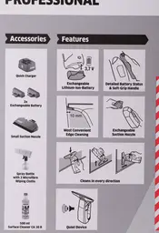 Комплектация• съемный литий-ионный аккумулятор; • зарядное устройство; • флакон пульверизатор; • всасывающая насадка - 280 мм; • насадка для протирания из микроволокна; • универсальное чистящее средство 0,5 л.