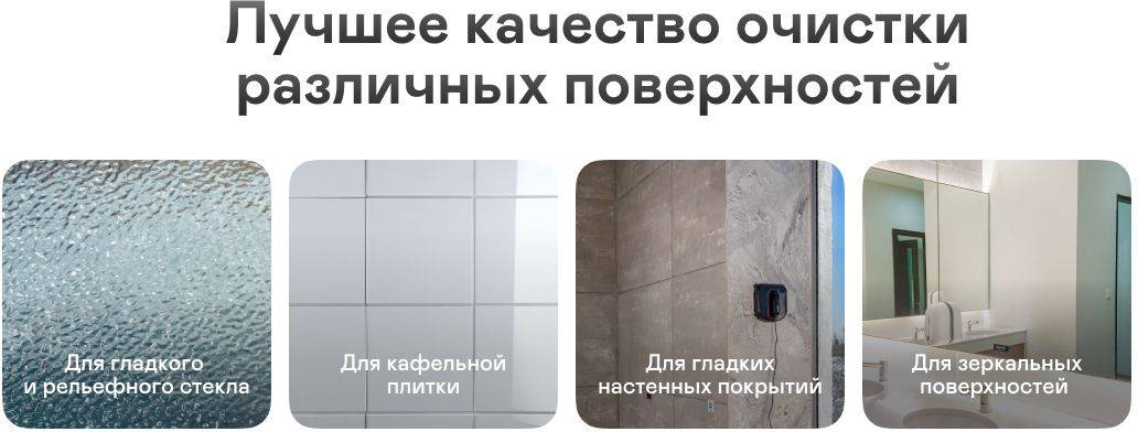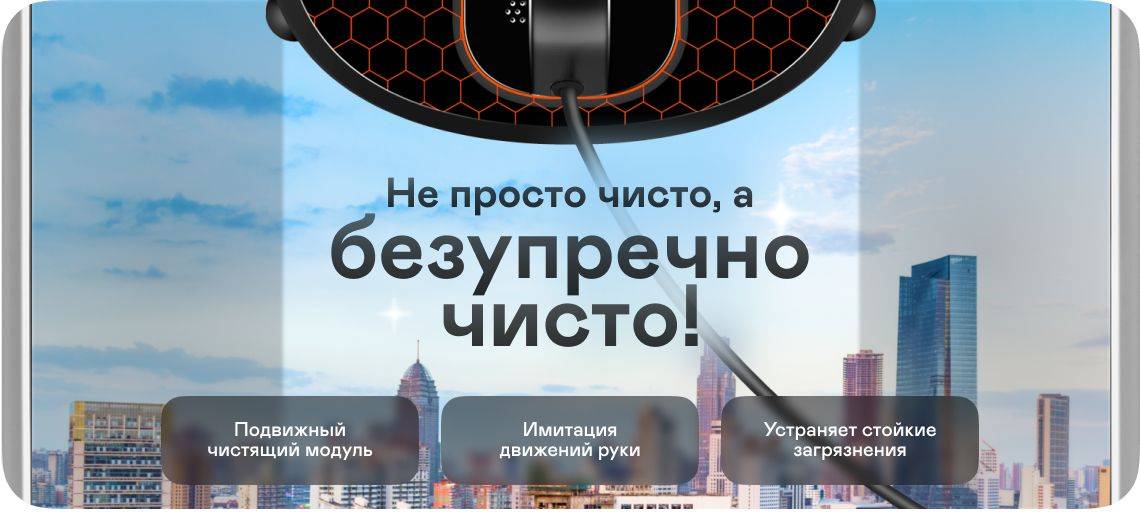 ОсобенностиПодвижный чистящий блок. Чёткое распознавание границ и очистка безрамного остекления.