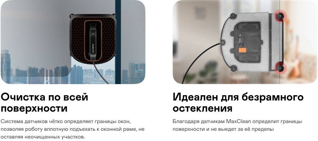 ОписаниеИмитация ручной очистки с подвижным моющим блоком. Безупречная чистота окон, кафеля и зеркал. Встроенные режимы работы, управление со смартфона и интеллектуальная система навигации. Всегда чистые окна с роботом-мойщиком GARLYN MaxClean.