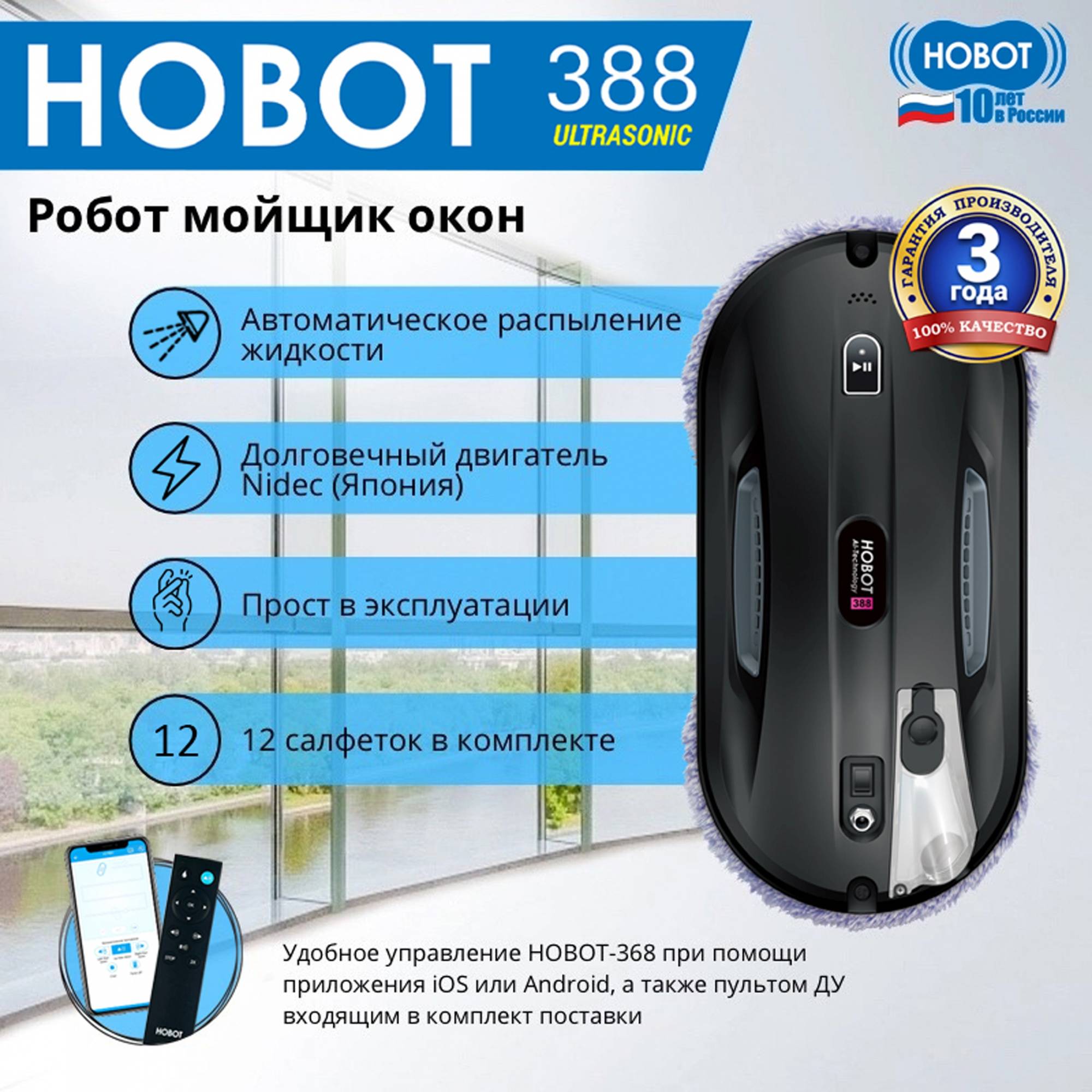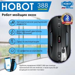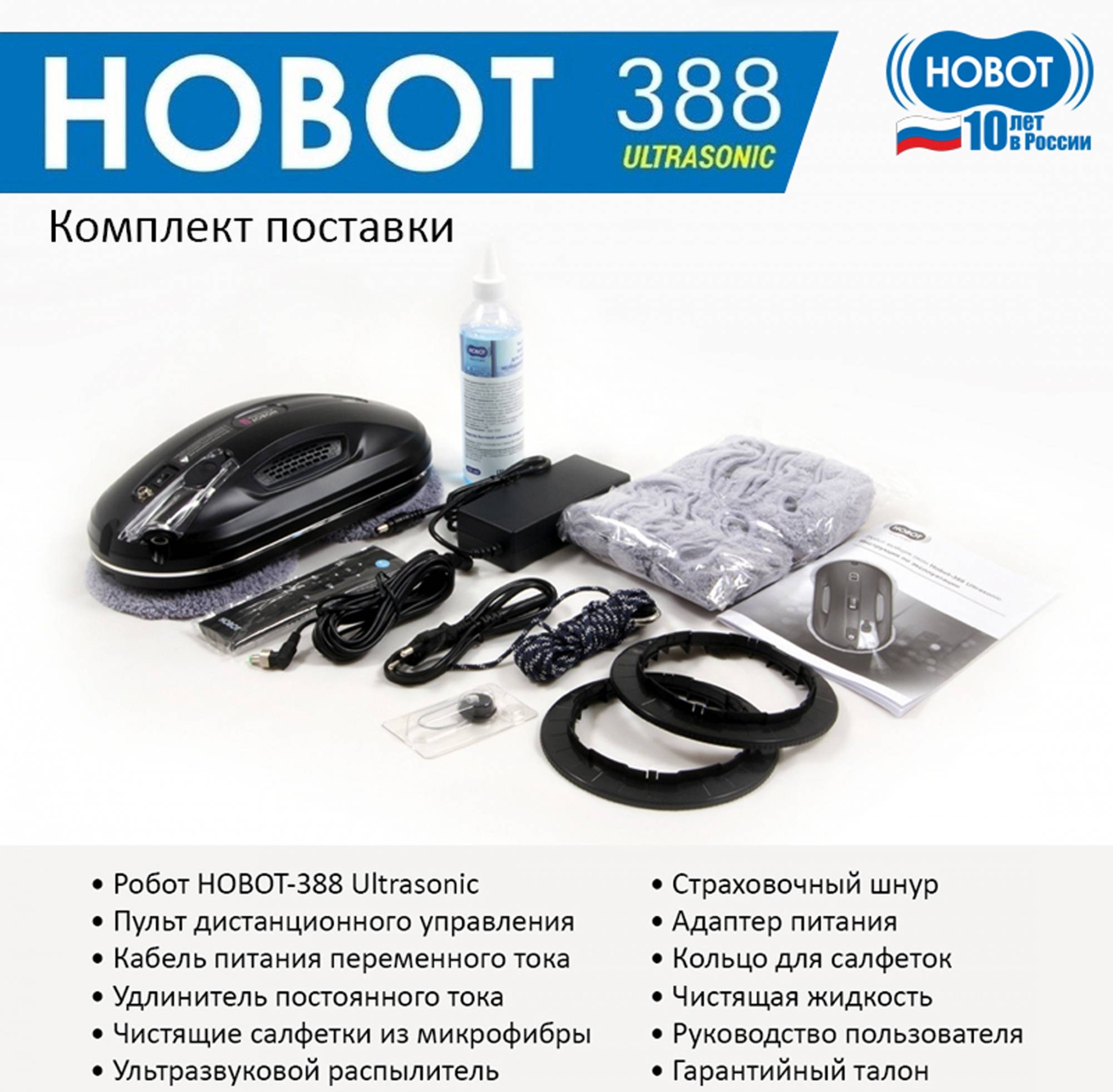 КомплектацияРобот HOBOT-388, страховочный шнур, пульт ДУ, адаптер питания, кабель питания, удлинитель, чистящие салфетки из микрофибры (12 шт. + 2 шт. на роботе), кольцо для салфеток (2 шт. + 2 шт. на роботе), ультразвуковой распылитель, чистящая жидкость (220 мл.), руководство пользователя, гарантийный талон