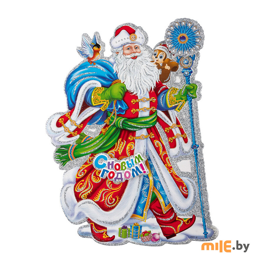 Данное изделие представляет собой яркую и красочную наклейку со специальным рисунком, изображающим Деда Мороза с подарками.