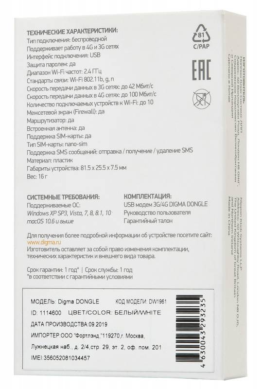 Описание4G USB модем со слотом для SIM-карты и встроенным Wi-Fi-роутером для раздачи интернета (до 10 пользователей). Может работать без компьютера - от блока зарядки USB или Power bank. Работает со всеми операторами связи.