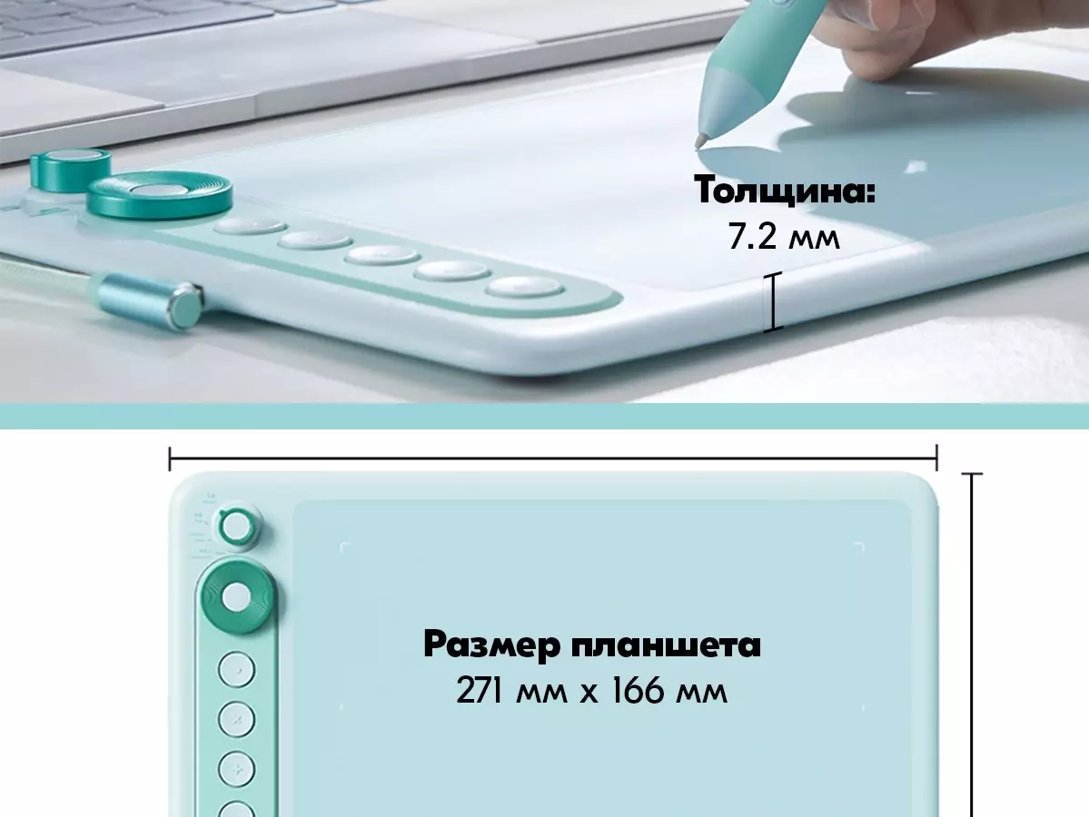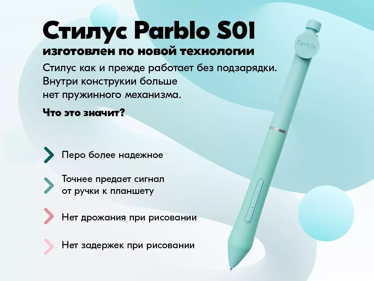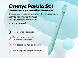 • Особенности Новый стилус S01. Его особенности: полностью устранен джиттер эффект (эффект подрагивания курсора) при рисовании. Изменена конструкция фиксирования наконечника пера - теперь наконечник неподвижен, это точнее передает нажим пера. Программируемое Dial-кольцо.Физический переключатель режимов планшета.