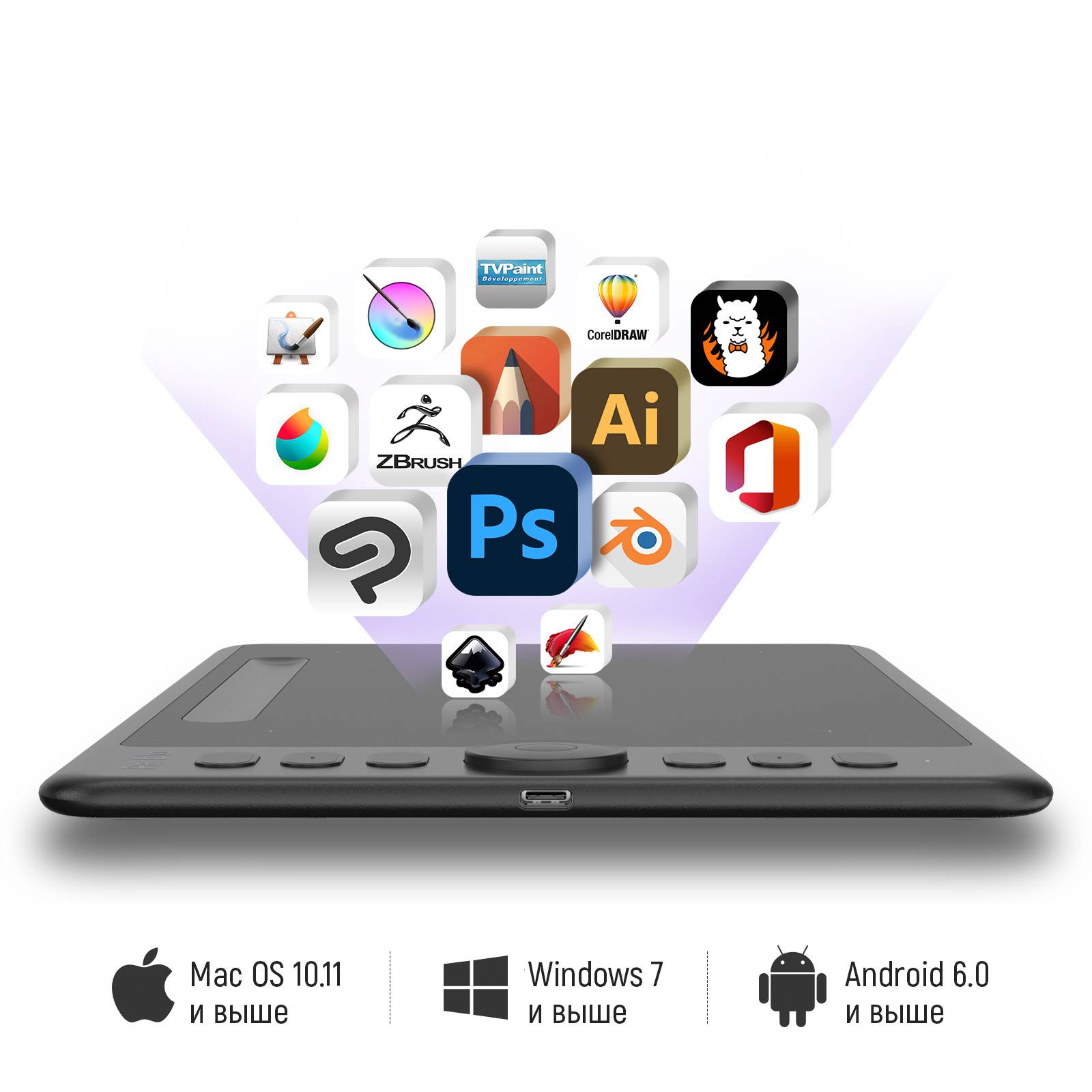 ОсобенностиParblo Intanbgo имеет программируемое Dial кольцо. Parblo Intangbo совместим со многими популярными графическими редакторами: Photoshop, SAI, Painter, Illustrator, Clip Studio, Crita и другими. В комплекте 2 OTG-переходника на USB Type-C и Micro.