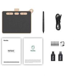 - Особенности Parblo Ninos имеют несколько цветовых решений: чёрный, зеленый и розовый. Parblo Ninos совместим со многими популярными графическими редакторами: Photoshop, SAI, Painter, Illustrator, Clip Studio, Crita и другими. В комплекте 2 OTG-переходника на USB Type-C и Micro.