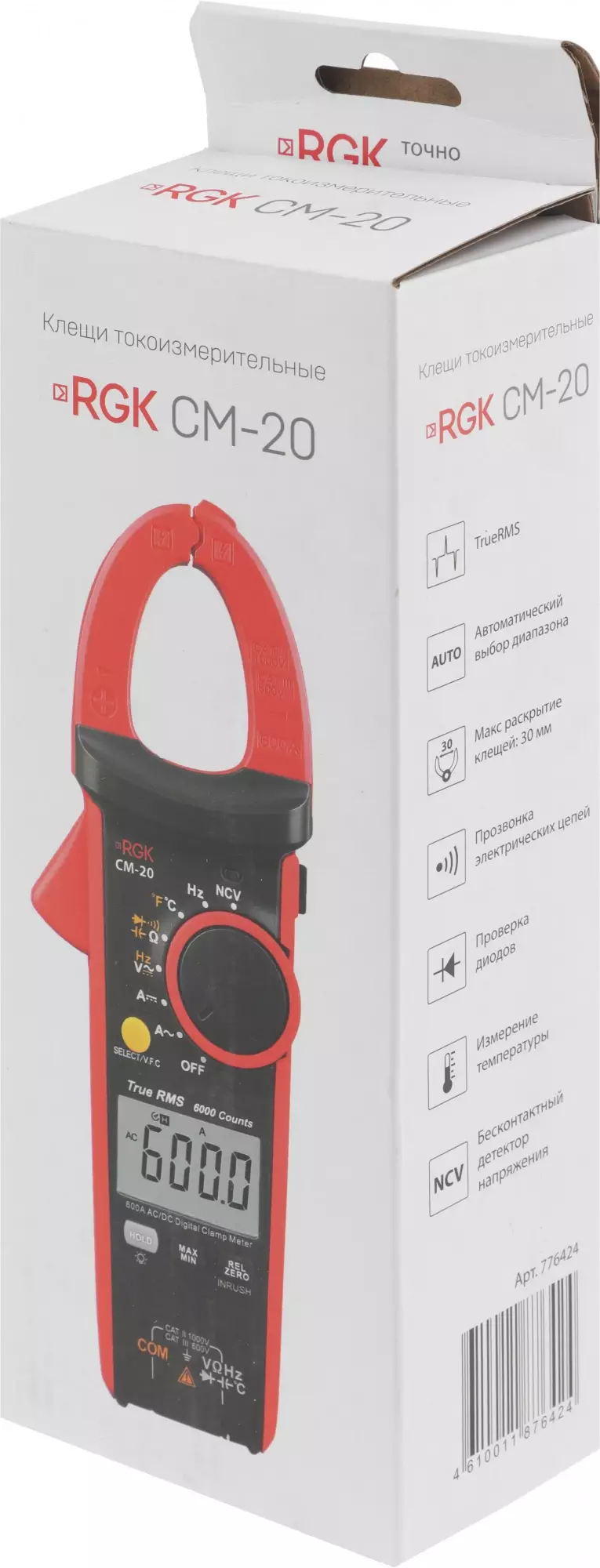 ОписаниеЦифровые токовые клещи RGK CM-20 применяются для бесконтактного измерения токов до 600А на проводниках диаметром до 30 мм. Этот прибор ускоряет и упрощает рабочий процесс благодаря тому, что нет необходимости разрезать, распаивать и скручивать обратно провода.