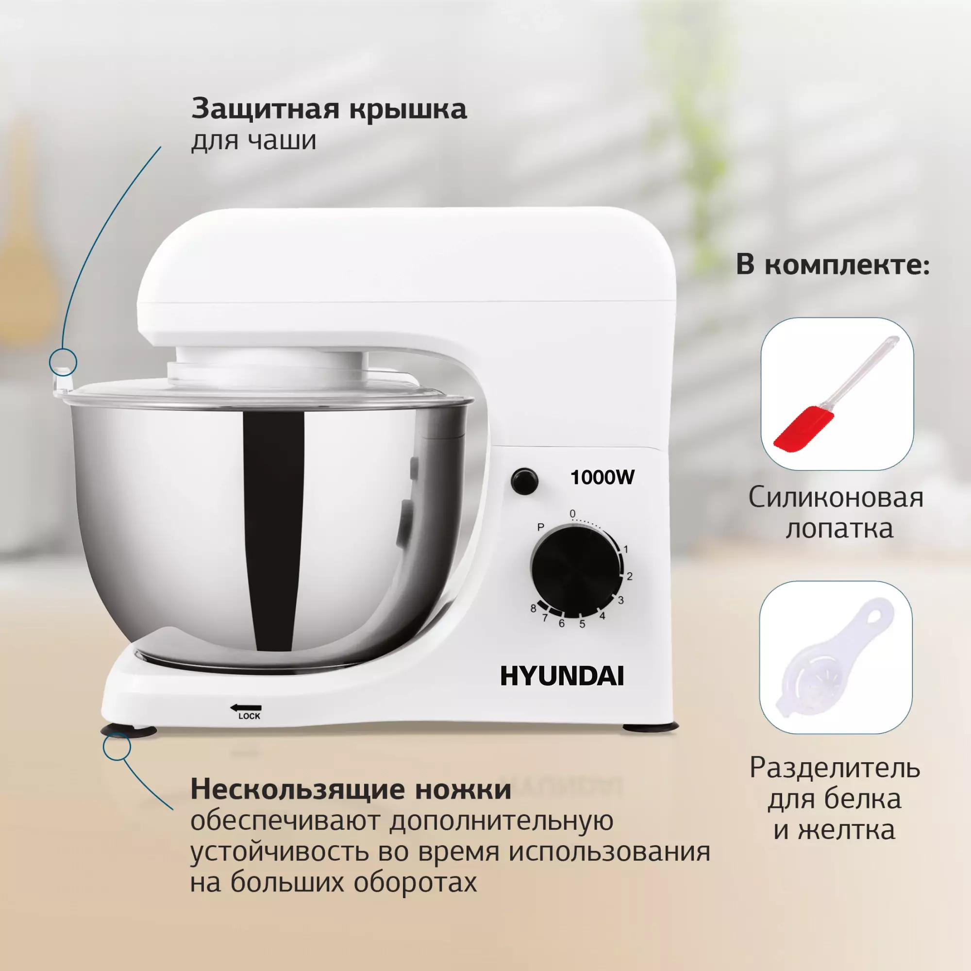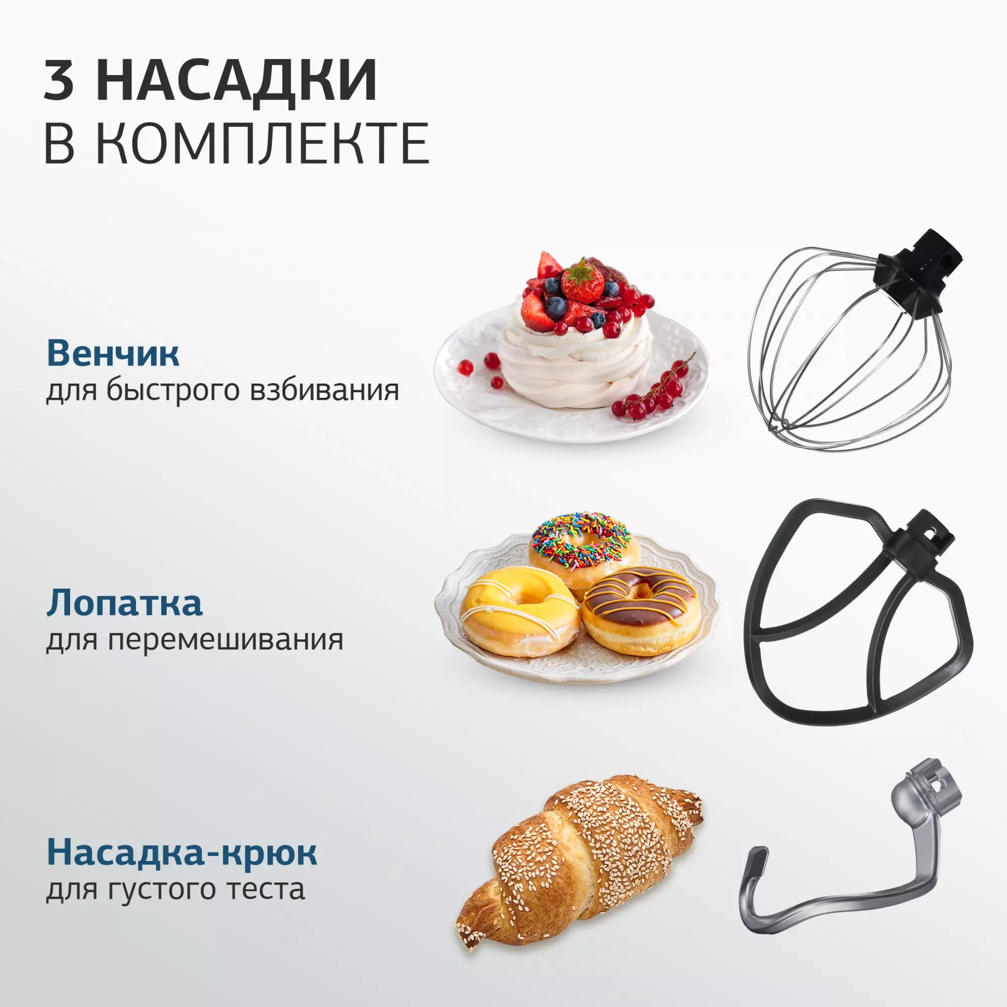 • Комплектация Планетарный миксер; чаша; защитная крышка; насадка-венчик; насадка-крюк; насадка-лопатка; кулинарная силиконовая лопатка; сепаратор для яиц; руководство пользователя с гаратийным талоном; книга рецептов