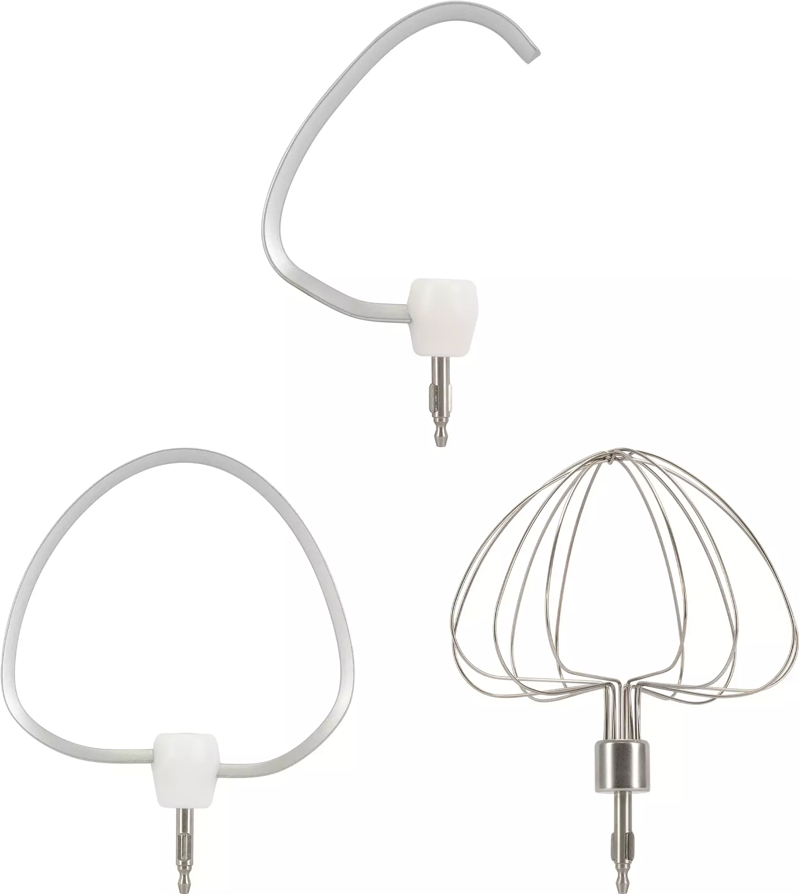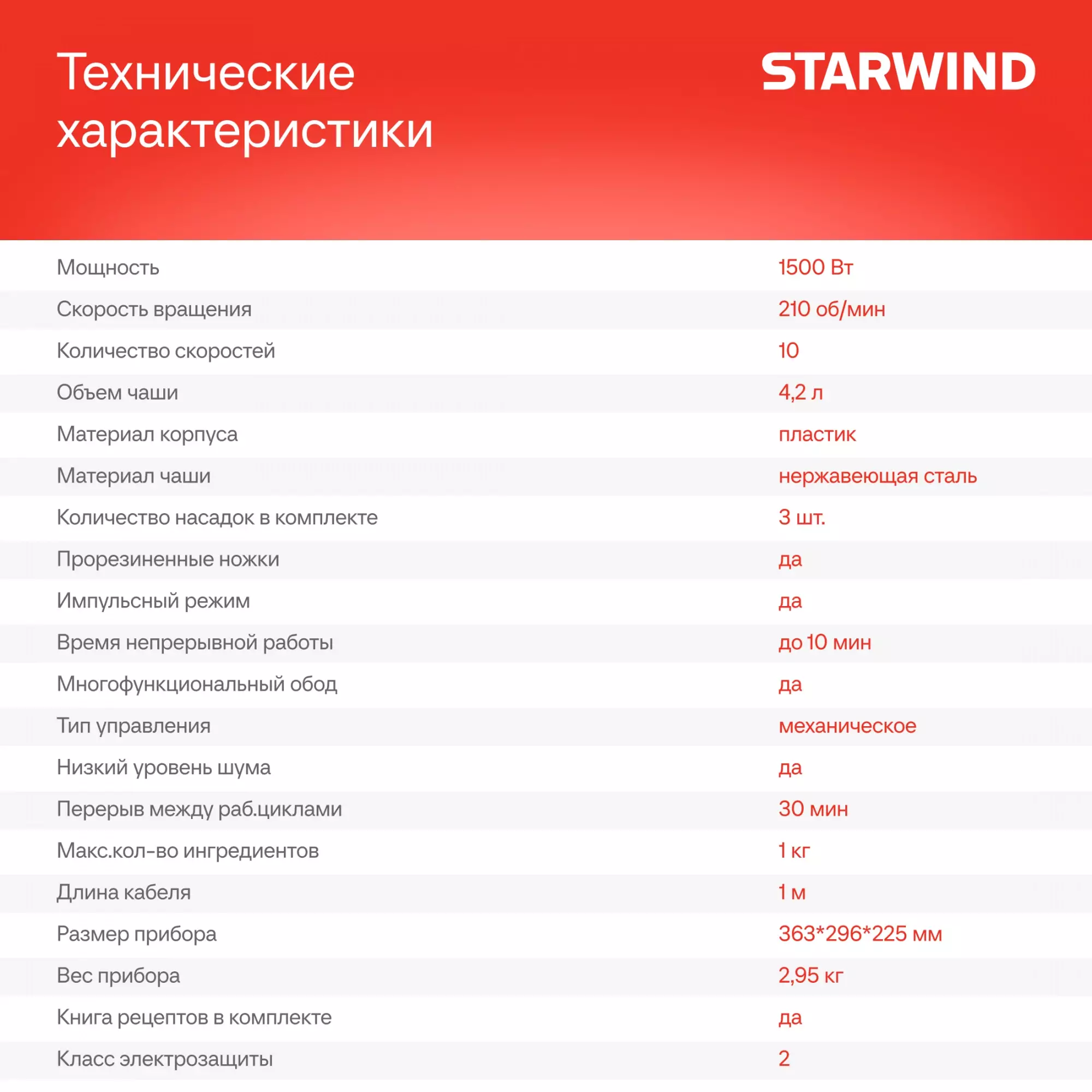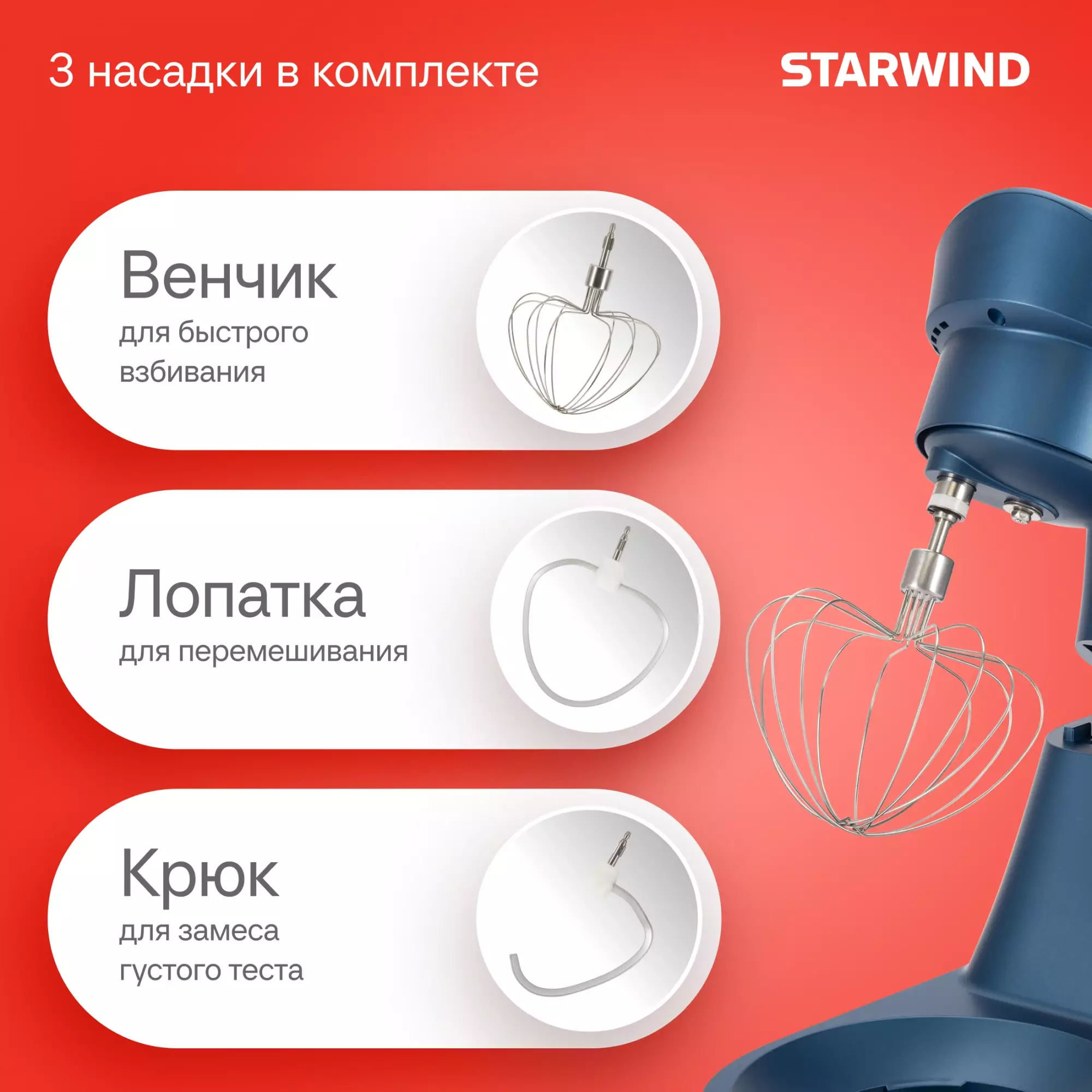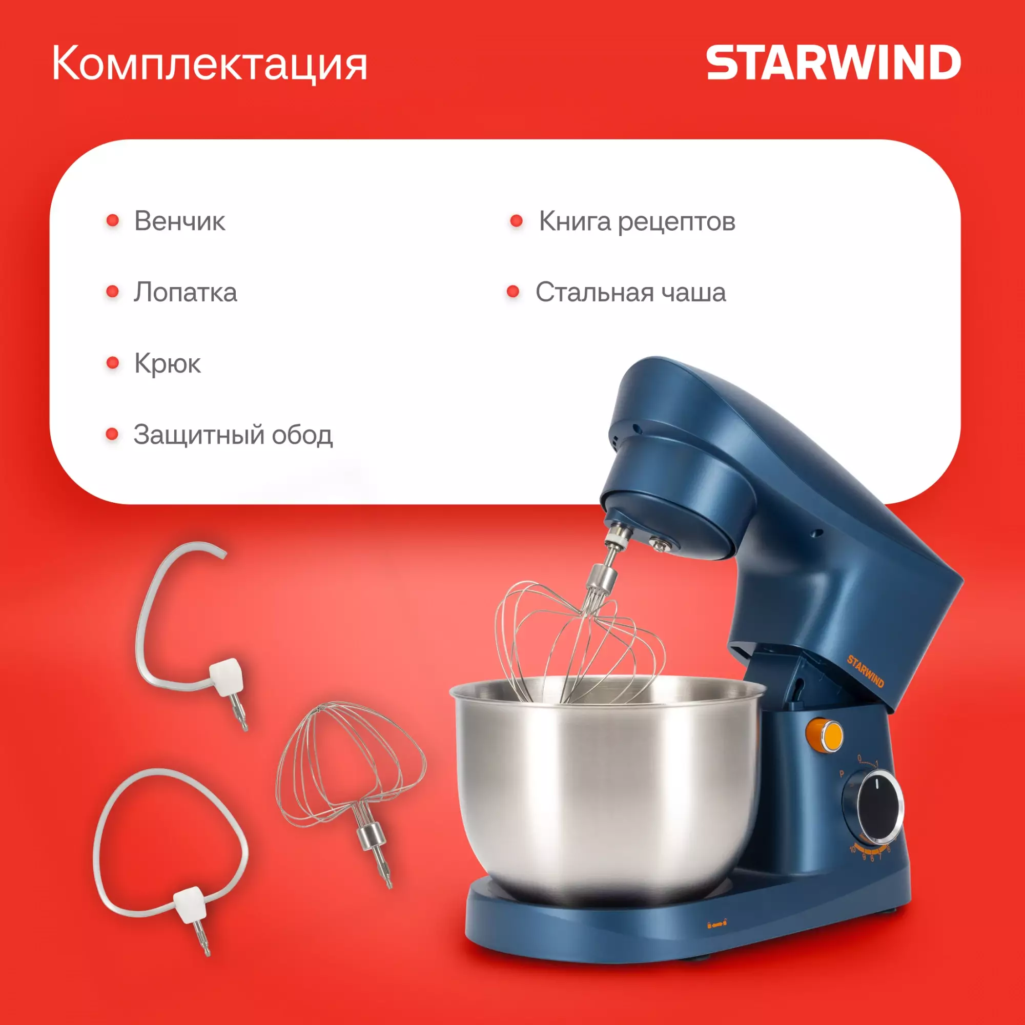 КомплектацияМиксер; чаша; насадка-крюк; насадка-венчик; насадка-лопатка; инструкция с гарантийным талоном; книга рецептов; мультифункциональный защитный обод